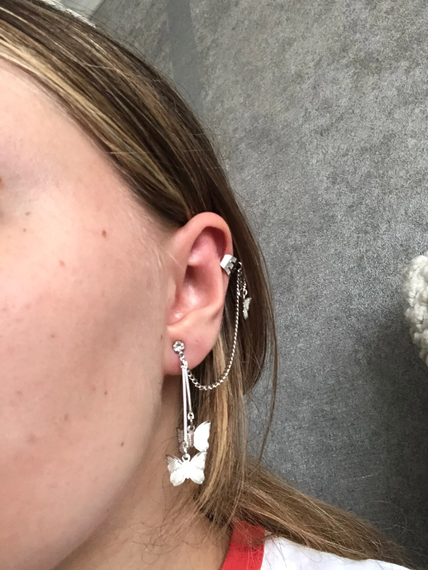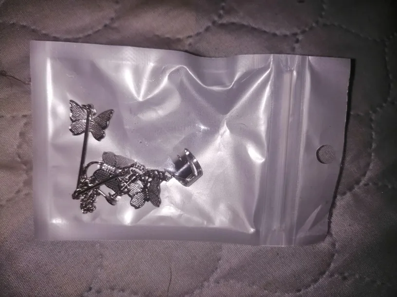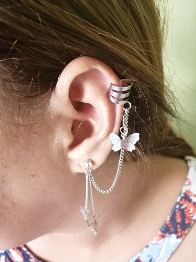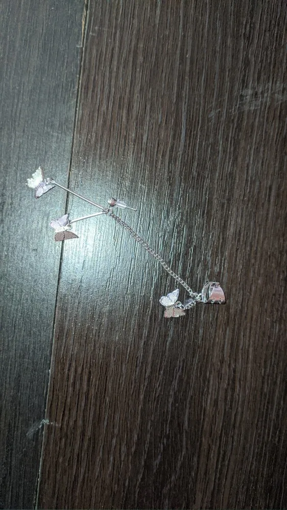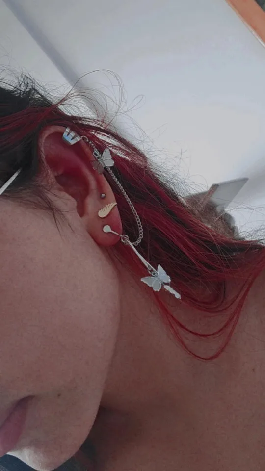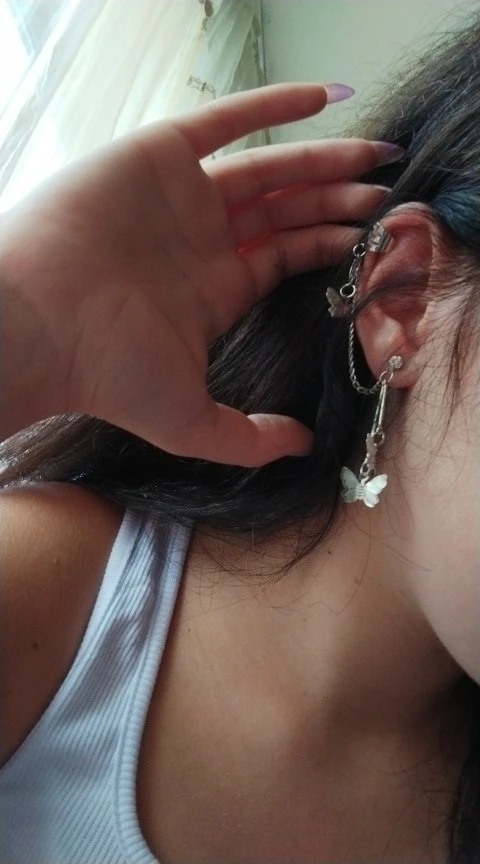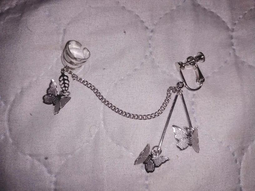 В комплекте действительно идут две сережки это супер круто. Бабочки перезваниваются, так что при любом движении вы будете слышать звук колокольчиков) сережки очень легкие, на ушах не ощущаются. И эта верхняя штука тоже норм, главное зажать ее так, чтобы не спадала, но при этом не жала(хотя и без регулировки держится ок)
