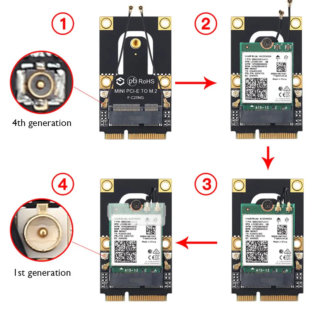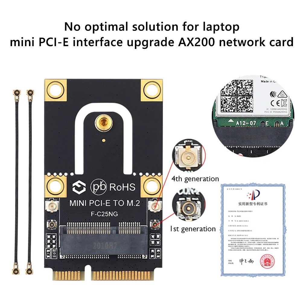 Улучшите пользовательский опыт, независимый дизайн, запатентованная модель, M.2 сетевая карта может быть непосредственно подключена к компьютерной антенне, обеспечивая удобство для пользователей для обновления (MHF4 к IPEX UFL, измените Интерфейс 4-го поколения собственной сетевой карты на старую антенну 1-го поколения ноутбука, вы можете напрямую использовать оригинальную антенну)