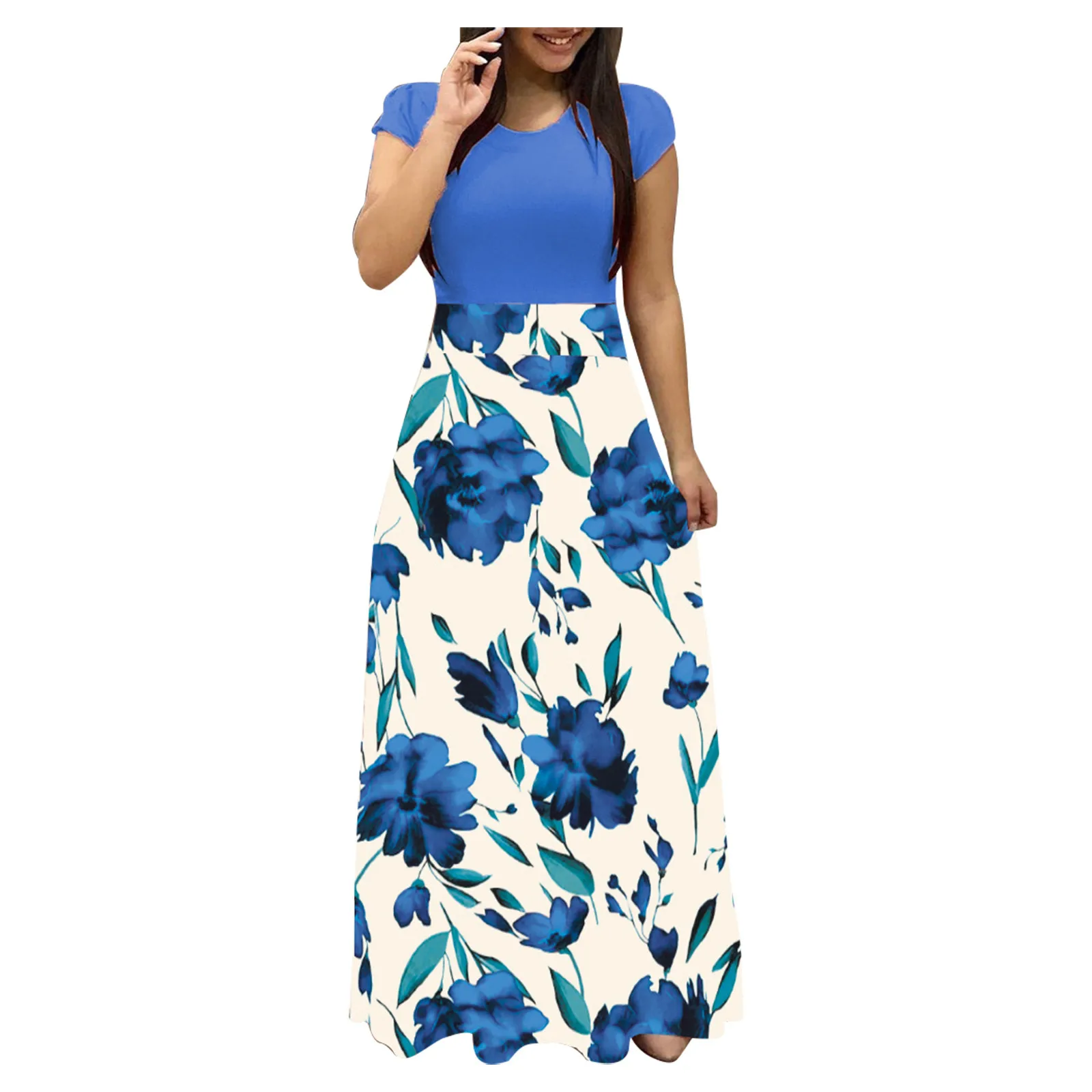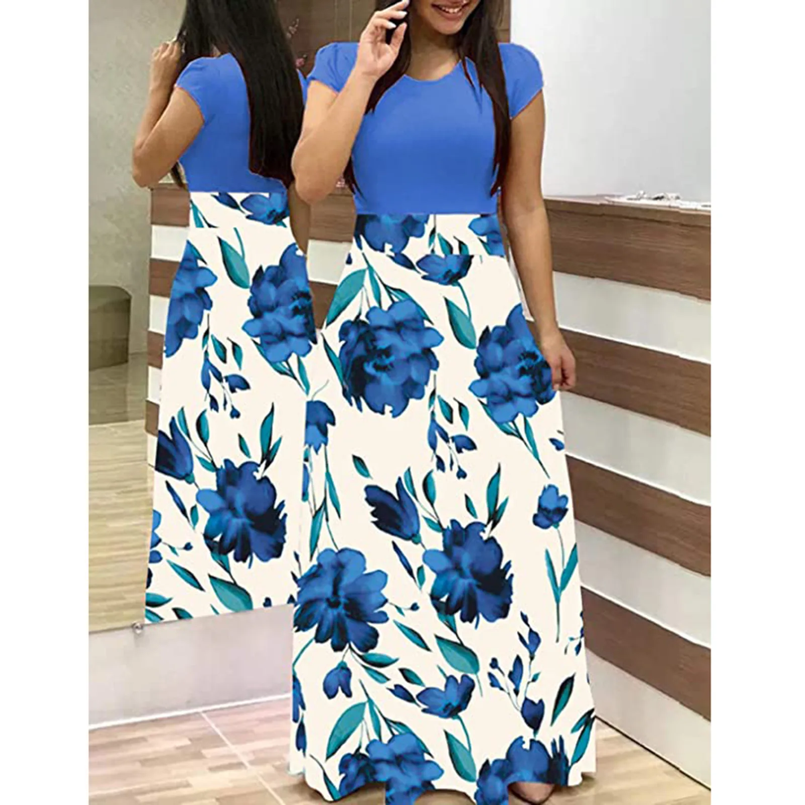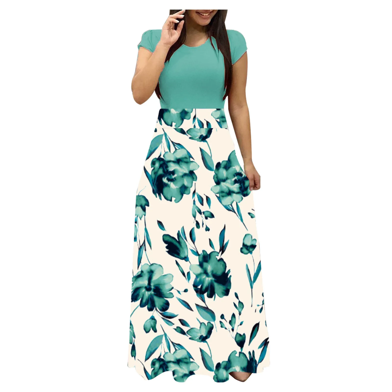 Стильное платье с цветочным принтом; Платье с коротким рукавом; Длинная юбка; Женская одежда
