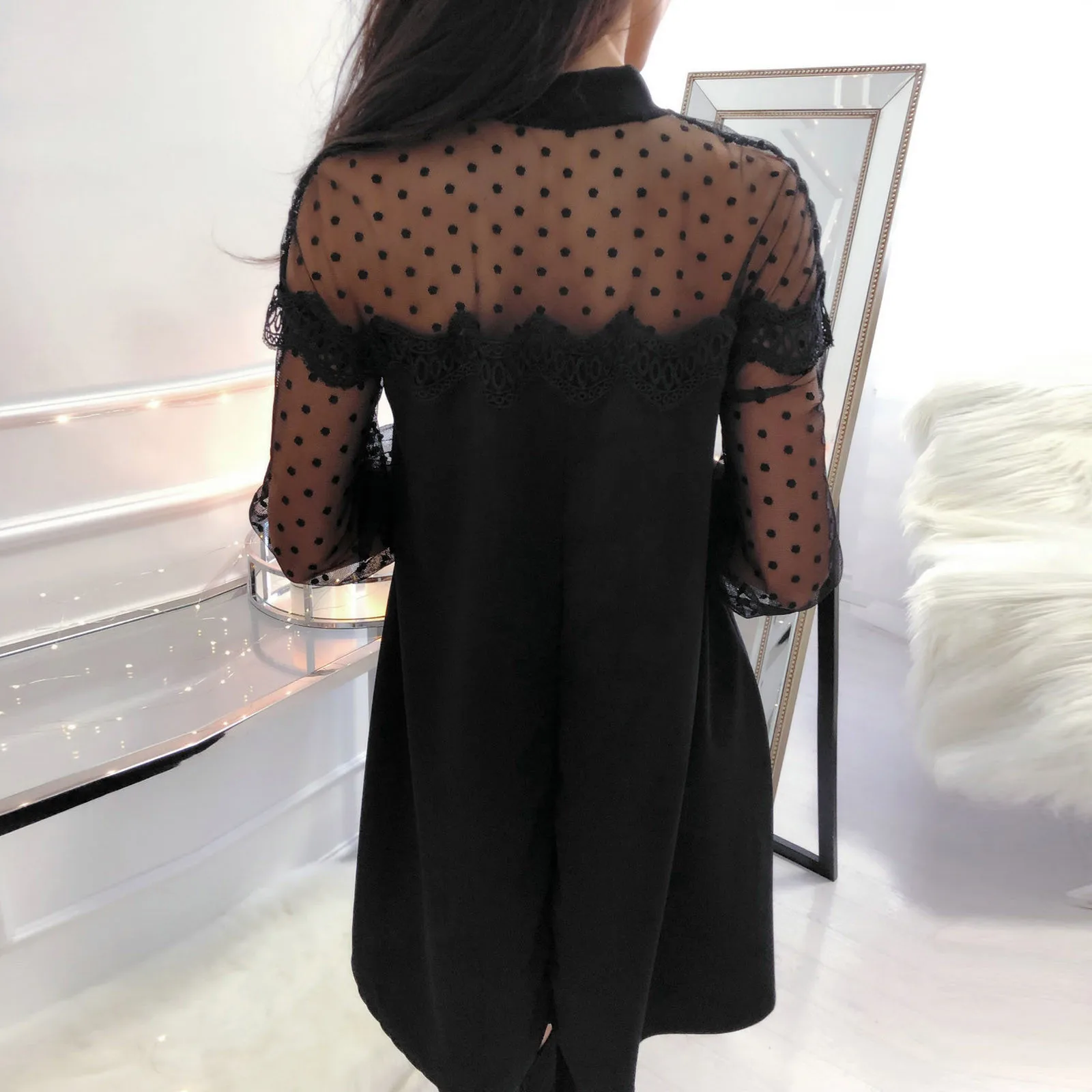 Женское кружевное мини-платье с круглым вырезом и длинным рукавом