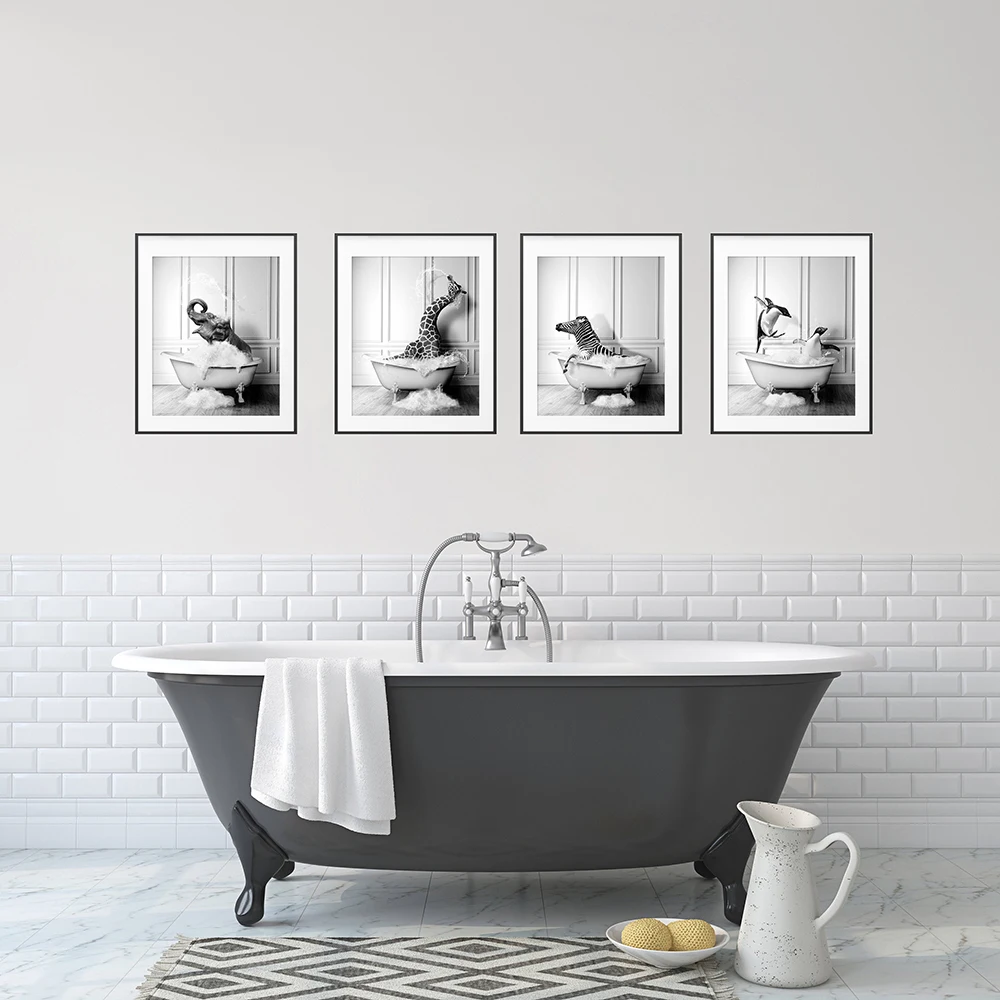 Черно-белые холщовые постеры с животными в ванне и принтом пингвина...