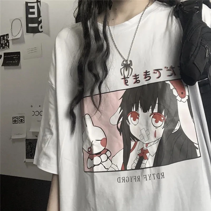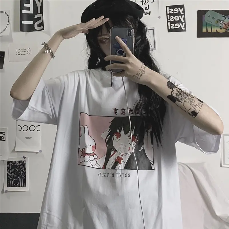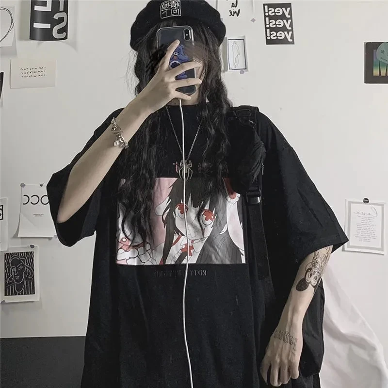 Футболка женская с коротким рукавом, свободная Готическая рубашка с аниме принтом в стиле Харадзюку, уличная одежда в стиле Темный гранж, большие размеры, y2k, лето