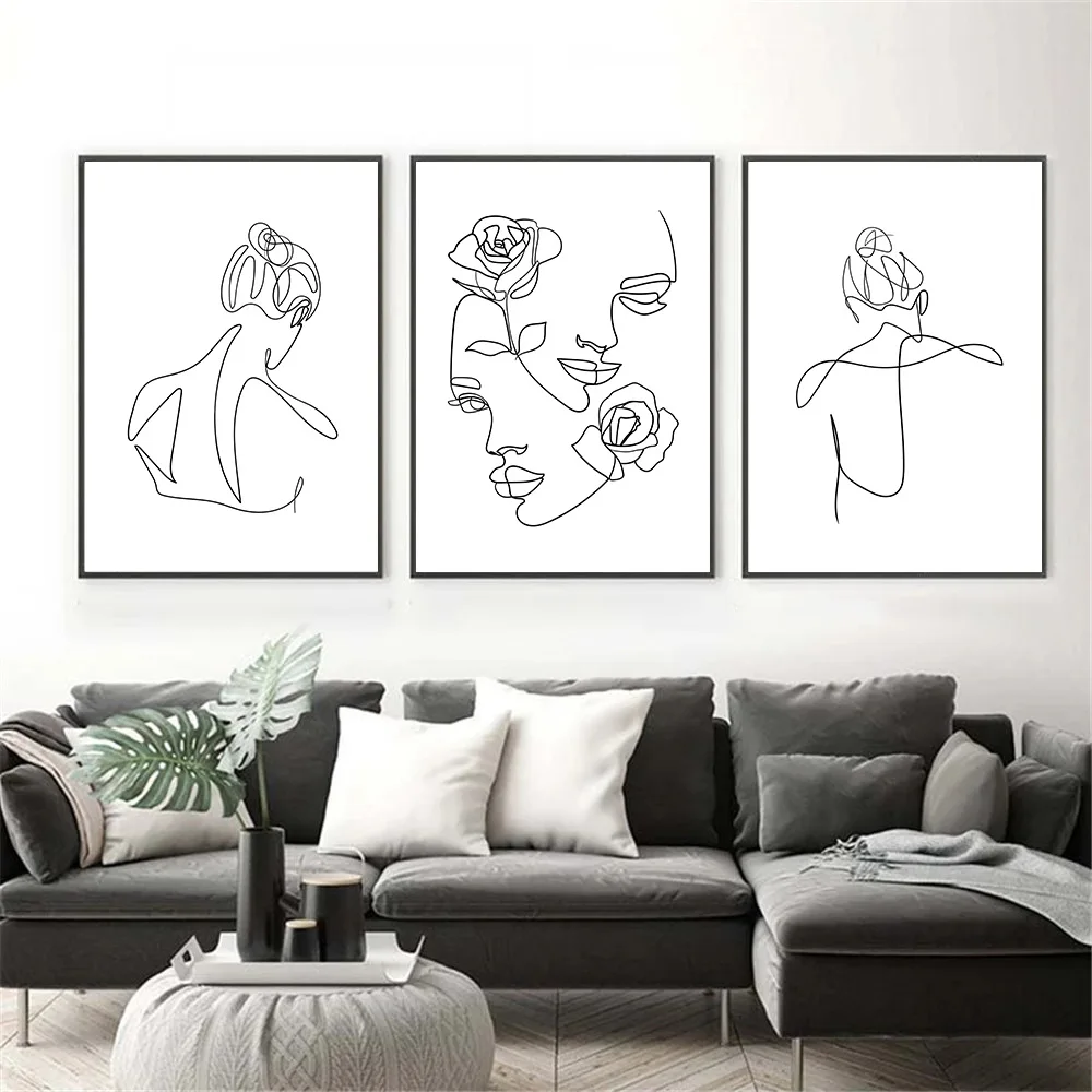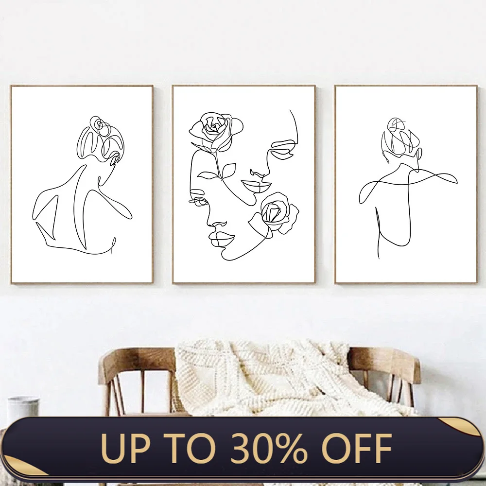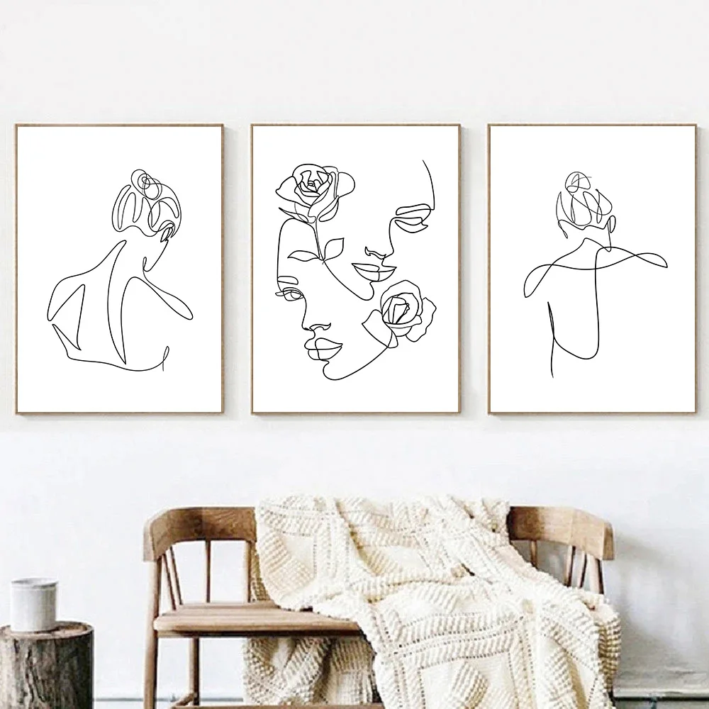 Рисунок на одной линии с изображением девушки, постер с изображением цветов, женщины, лица, абстрактная живопись, линия, настенное искусство, холст, картина для гостиной, домашний декор