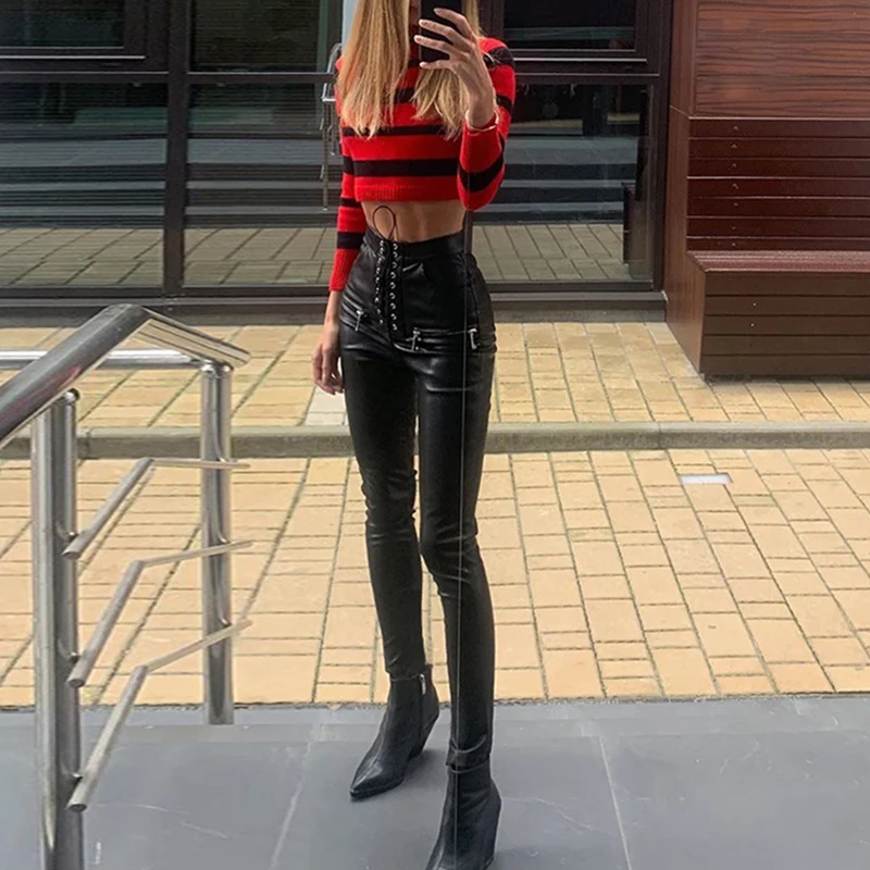 Черные брюки-карандаш из искусственной кожи на шнуровке с высокой талией, облегающая уличная одежда, Осенние повседневные брюки, женская уличная одежда