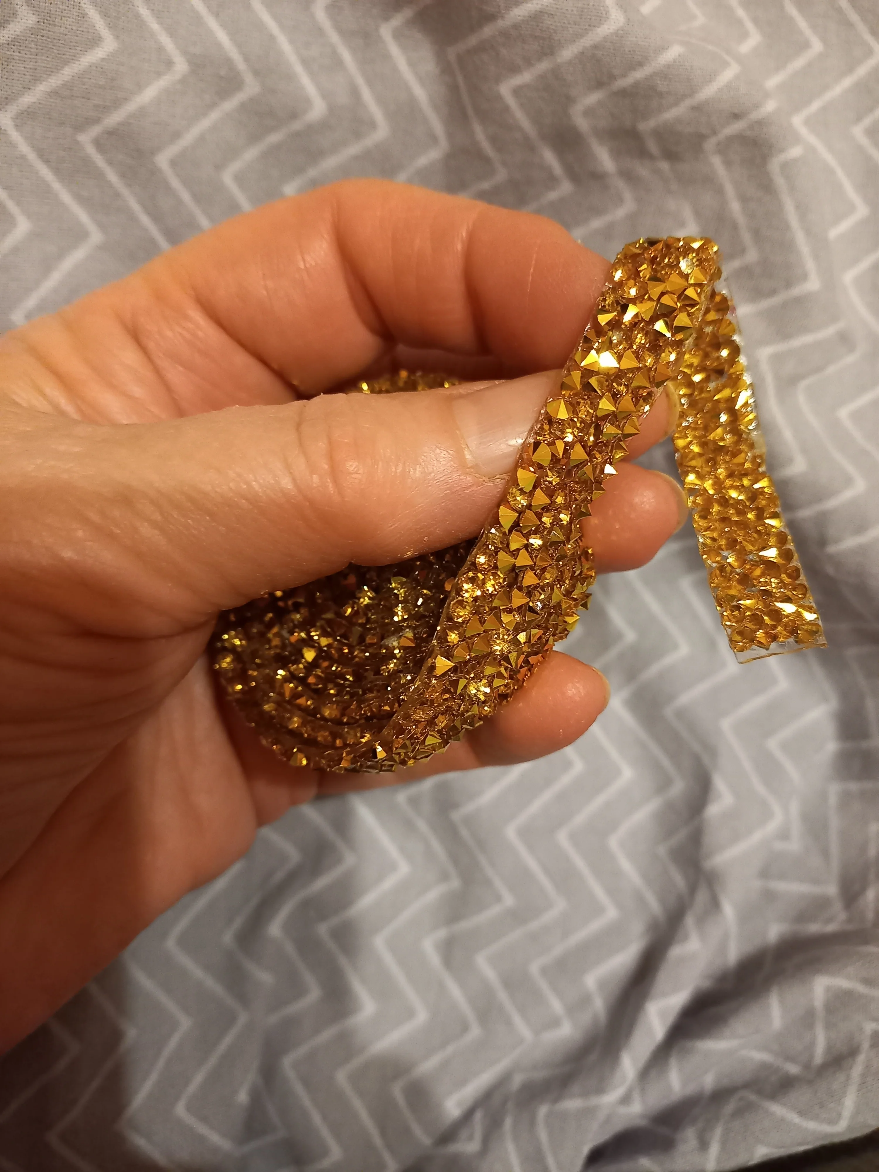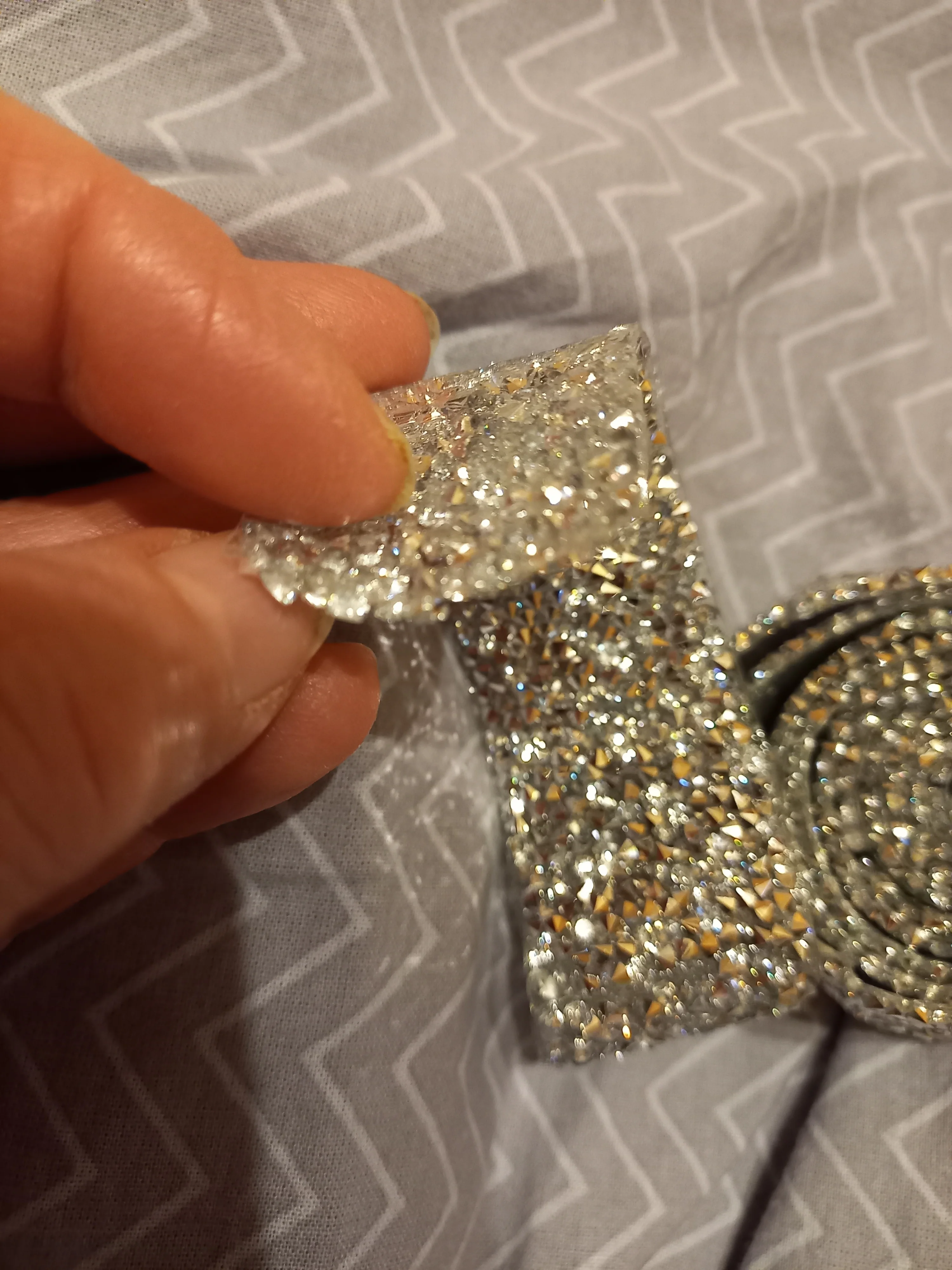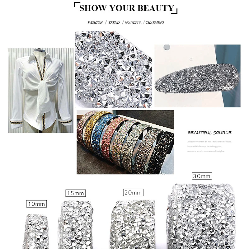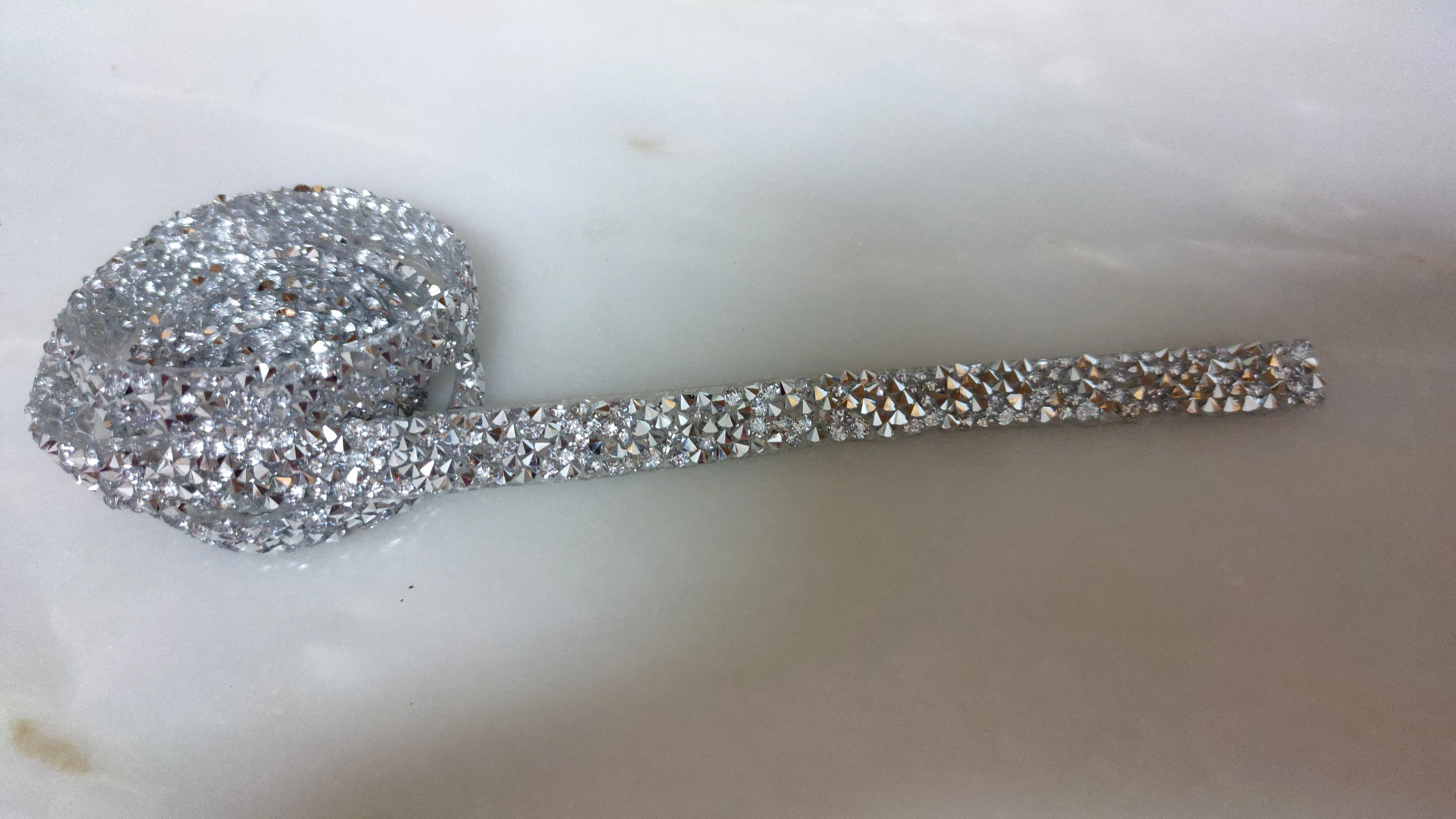 Отличная лента со стразами! Моё фото не очень хорошо передаёт цвет, такое впечатление, что цвет страз состоит из смеси серебристого с золотистым. На самом деле чисто серебристый цвет, размер дальше больше заявленного. Стразы наклеены очень плотно и качественно.
