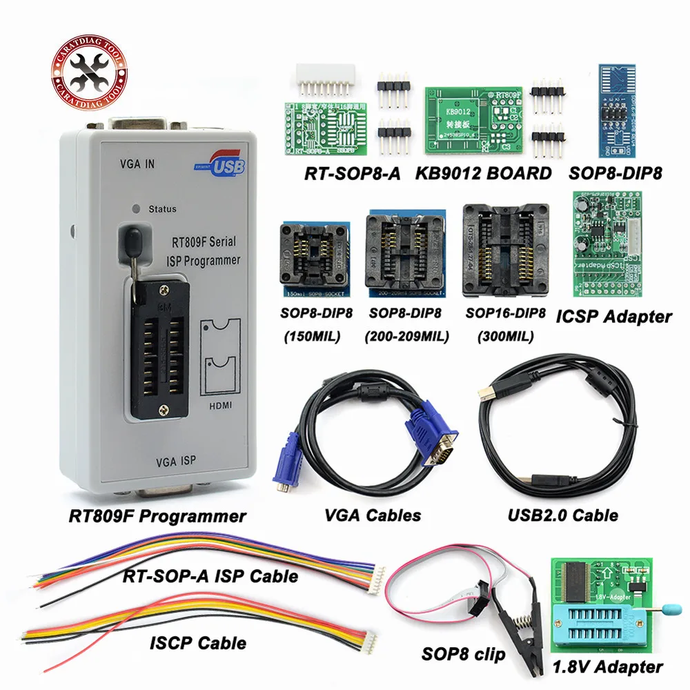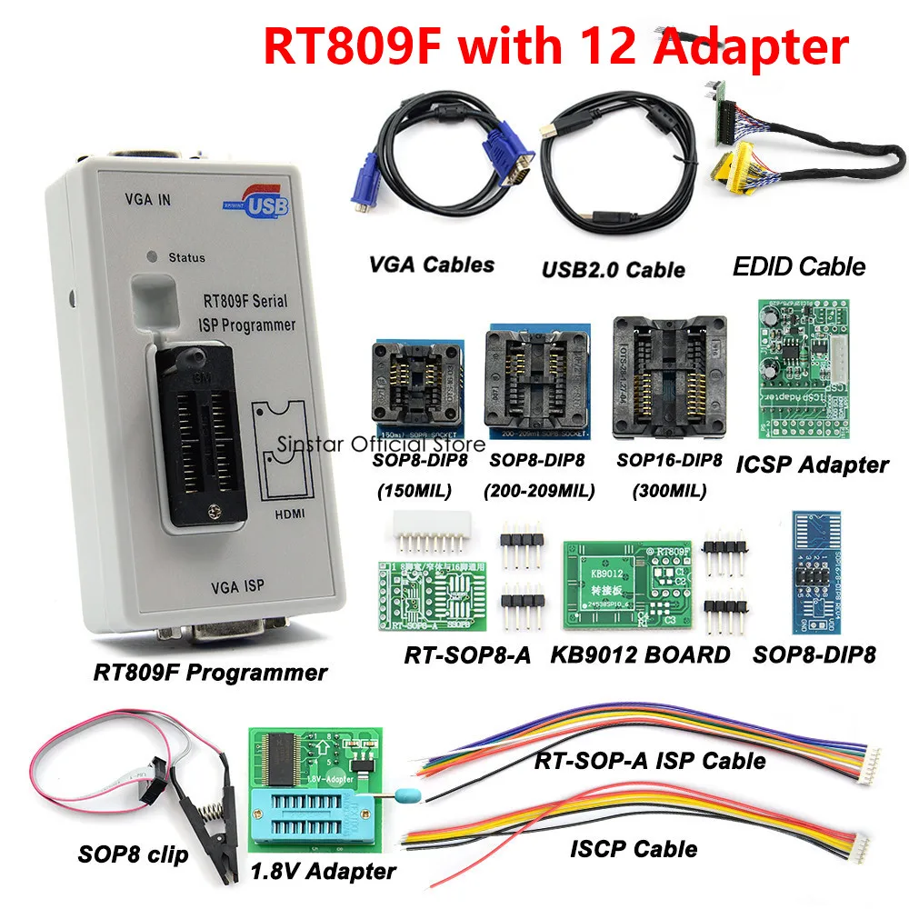 RT809F серийный ISP программист с 11 адаптерами первоначально поддерживает компьютерные материнские платы, ноутбук, ЖК-дисплей, роутеры для чтения и записи