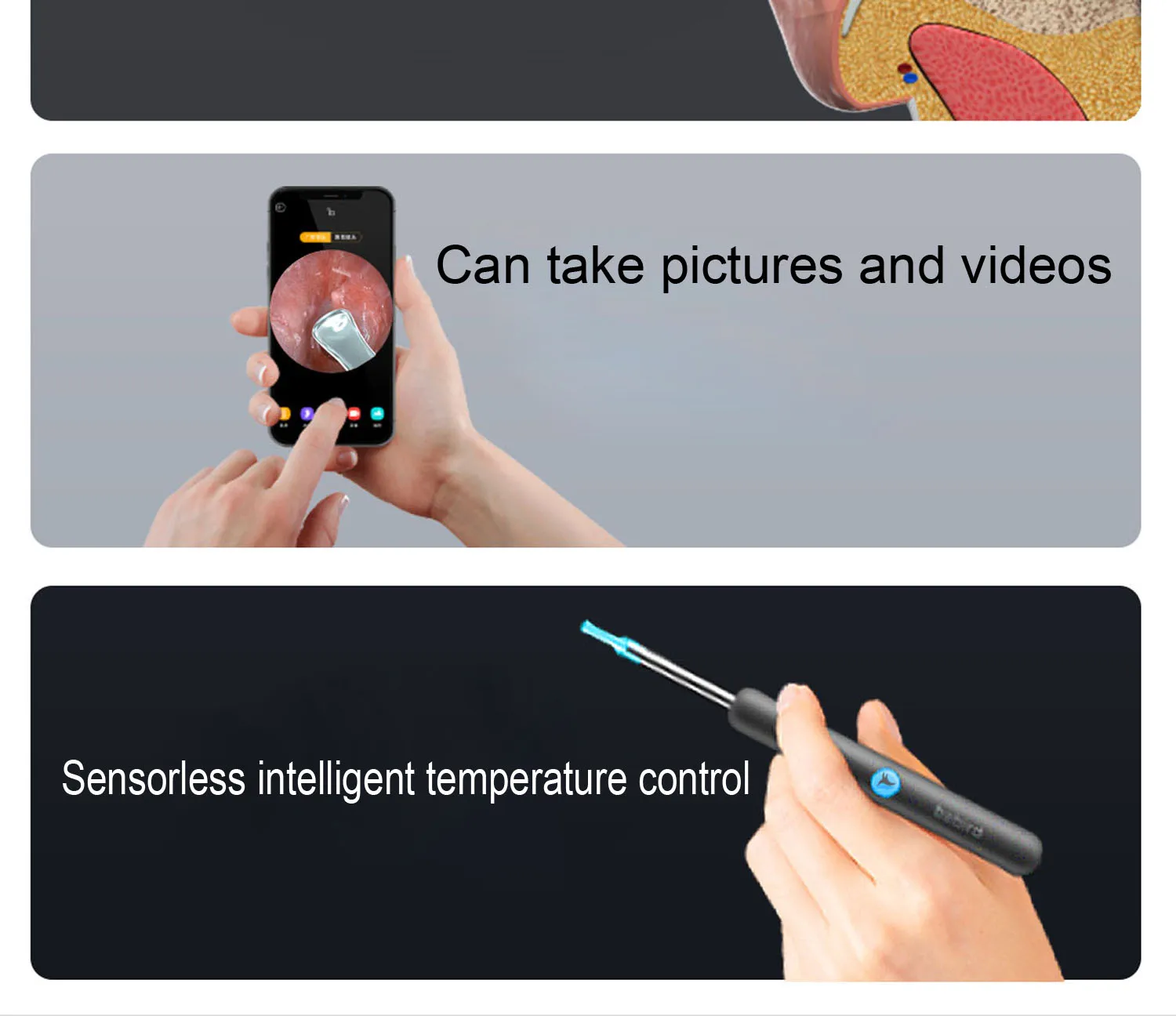 Быстрое визуальное подключение Wi-Fi. Для открытия ушей не требуется подключение. Используйте оптические линзы и высокую производительность 300 Вт пикселей. Cmos-датчик имеет четкое изображение, 20x усиливающий ушной канал и 55 ° угол обзора. 13 комбинированных линз и 6 светодиодный ламп. Водонепроницаемый объектив IP67. Можно стирать в воде. Адаптируется к сухим ушам, масляным ушам и другим сложным условиям. 3 оси smart направленного гироскоп быстрого позиционирования, экран, нет ошибок и встряхните. Высококлассная технология кодирования видео OV chip, синхронная захватывающая синхронизация рук и глаз! Сильный сигнал WiFi, проникающая мощность, Избегайте задержки. Более безопасная защита. Пряжка для ушей, защита от перегрева, автоматическое отключение времени, блокировка детей и защита от мороза. Умный постоянный контроль температуры. Предотвращение низкой температуры и горения ушей. Otoscope: 25 °C неиндуктивная температура. Корпус наушника: 32 °C температура ладони. Длительная выносливость. Встроенный аккумулятор емкостью 250 мАч. Выбор раз в неделю в течение 10 минут, можно использовать около 30 дней.