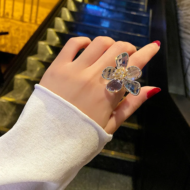 Новое модное открытое ювелирное изделие из высококачественной меди, инкрустированное хрустальным цветком, большое роскошное кольцо для коктейвечерние для женщин