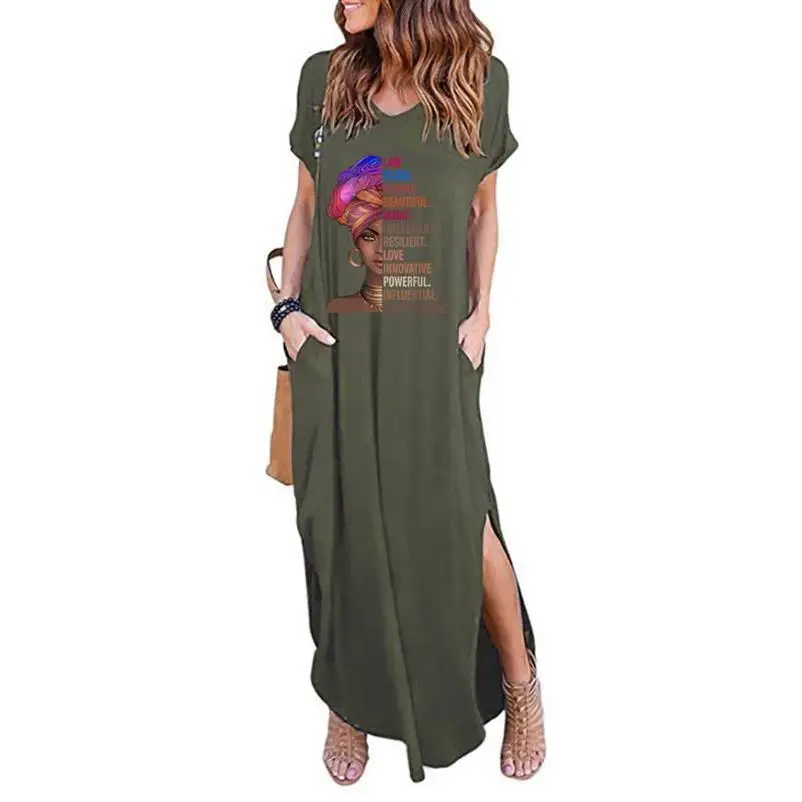 Платье женское длинное с карманами, V-образным вырезом и коротким рукавом