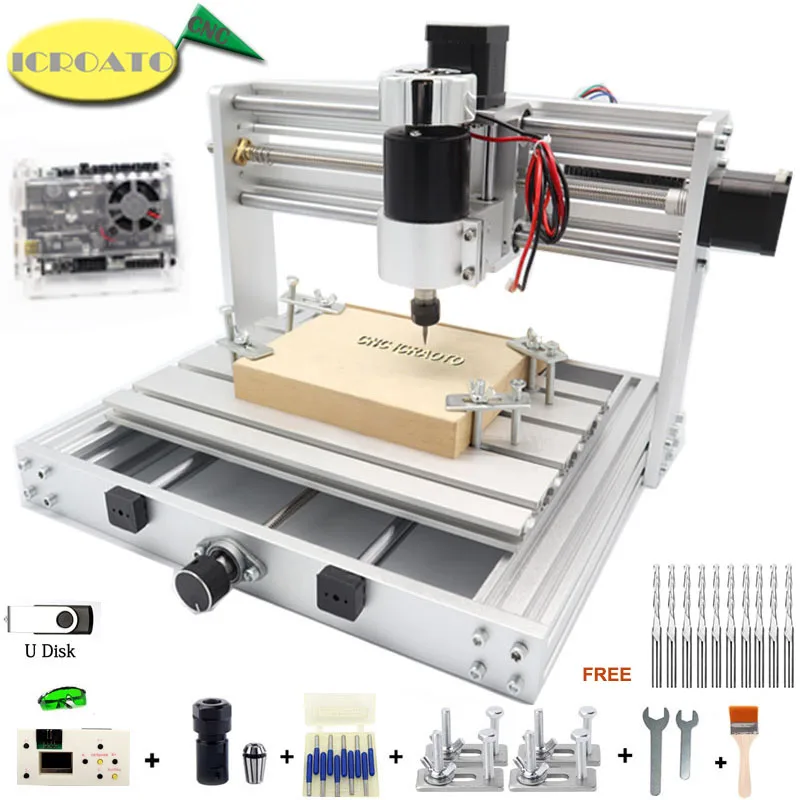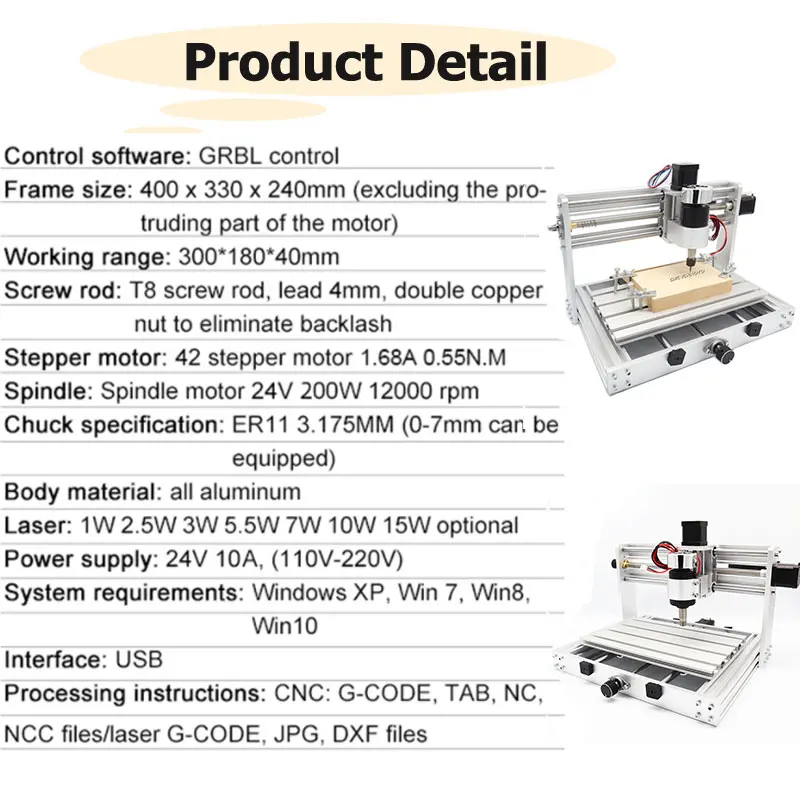 1. Корпус из алюминиевого сплава, рама состоит из 4040 алюминиевой profileand10 мм толстой алюминиевой пластины. Части X, Y и Z производятся обрабатывающим центром с ЧПУ, интегрированным формованием, несплайсингом, стабильной структурой и высокой точностью. 2. Промышленный высокомощный источник питания, номинальная мощность 240 Вт, максимальная мощность 250 Вт. 3. Он принимает 52 мм Диаметр профессионального шпинделя с воздушным охлаждением с номинальной мощностью 200 палочек Максимальная мощность до 300 Вт. Характеристика: Рабочая зона: 300x180x40 мм (около 11,81x7,08x1,57 дюймов) Mesa: 300x180 мм (около 11,81x7,08 дюйма) Рама: 360x310x225 мм (около 14,17x12,20x8,85 дюйма) Материал: корпус алюминиевого профиля (алюминиевая пластина 10 мм, алюминиевый профиль 40x4 0) Шаговый двигатель: 3x42 шагового двигателя (1.3A, 0,25 нм) Шпиндель: 200 Вт 52 мм воздушное охлаждение Шпиндель, 12000 об/мин (номинальная мощность 200 Вт, максимальная мощность 300 Вт) Сбор: ER11 (по умолчанию 3,175 мм) Подключение: PC-USB соединение (Windows XP/ Win 7/Win 8 / Win 10 / Offlineline) Источник питания: 24VDC 10A адаптер питания (110-240VAC входное напряжение) Плата управления: обновленная версия с корпусом и вентилятором, лучше подходит для защиты от пыли, охлаждения и продления времени гравировки и срока службы, прошивка GRBL1.1f, поддержка работы в автономном режиме Автономный контроллер (опции): 1 дюймовый ЖК-дисплей, поддержка gcode, txt, tap, nc, ncc, cnc и других форматов обработки файлов, с 1 Гб micro SD картой (с TF) Использование с шпиндельным мотором (фрезы): Программное обеспечение дизайна: камера Программное обеспечение управления: GRBL (GRBLcontrol/Свеча) Формат файла: код G (gcode/txt/nc/ncc/tap/...) Мощность шпинделя: 200 Вт Скорость вращения шпинделя: 12000 об/мин Метод обработки: рельеф/сверление/резка Обрабатываемый Материал: дерево/пластик/PCB/акрил/Фанера/... Использование с лазером: Программное обеспечение для проектирования: программное обеспечение для редактирования фотографий (Photoshop/AI/...) Программное обеспечение управления: LaserGRBL