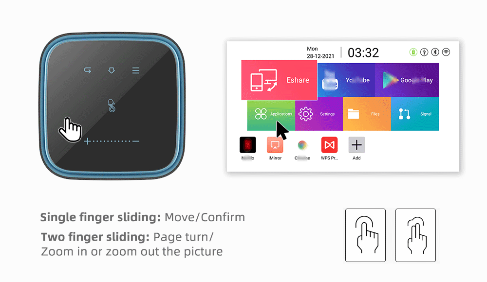 > GPU: Mali400 MP2 GPU> WiFi Дисплей Snyc, функция мульти-экрана: Eshare/Airplay/MiraCast> Память: RAM 2G, ROM 16G