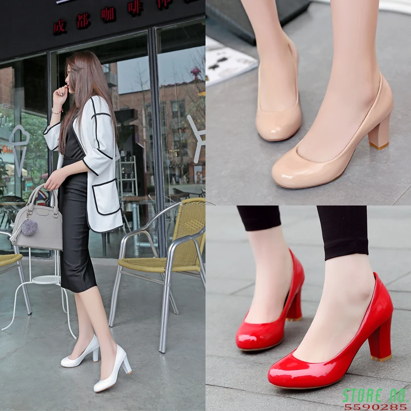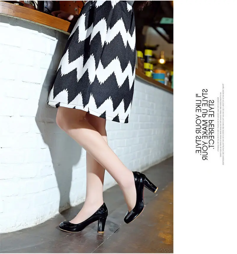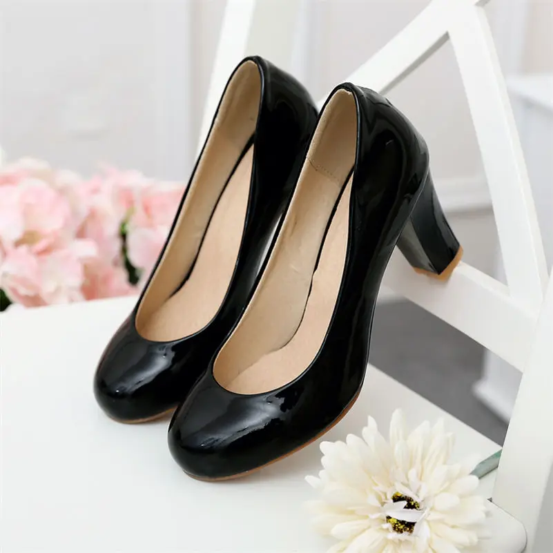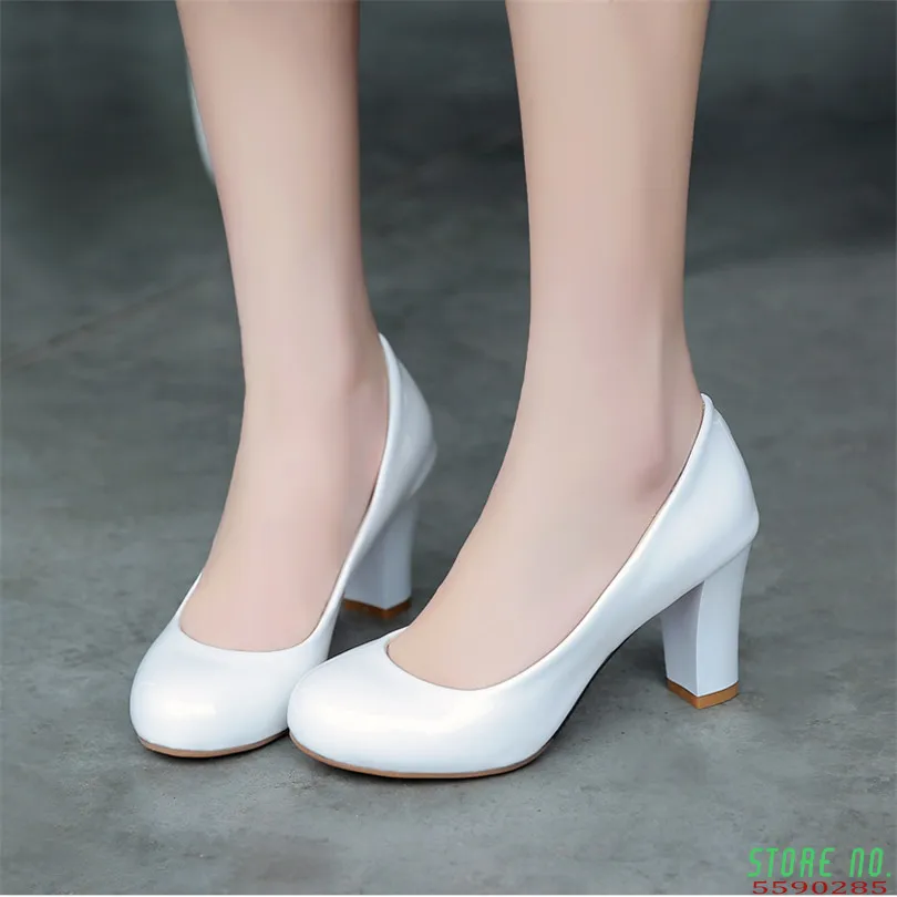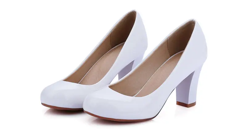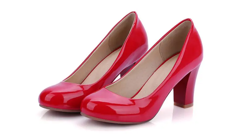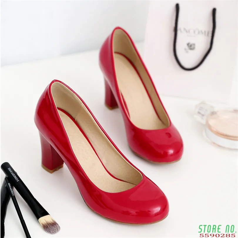 Большой Размеры весенние женские туфли-лодочки массивном широком каблуке; На высоких каблуках; Цвета: красный, черный, Лакированная кожа круглый носок белое свадебное платье Вечерние офисные женские туфли