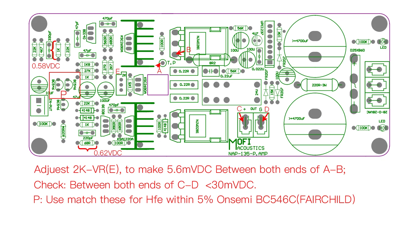 Так как отверстия PCB покрыты, вам нужно только припаять детали снизу платы. Не просверливайте и не увеличивайте отверстия, потому что это повредит сквозное покрытие.Очистите обе стороны чистой печатной платы бумажным полотенцем и изопропиловым спиртом или электронным Флюсом, затем припайте компоненты к доске, начиная с самых низких профильных деталей.Убедитесь, что правильная часть входит в каждую позицию на печатной плате. Измерьте каждый резистор с помощью мультиметра, чтобы убедиться, что это правильное значение.Очистите остатки потока припоя от доски с помощью изопропилового спирта (или электронного флюса) и кисти.Осмотрите все припоя тщательно, используя увеличительное стекло, чтобы убедиться, что нет паяных мостов или холодных припоя. Используйте мультиметр в шкале Ом для проверки коротких замыканий. Как минимум, вы должны убедиться, что входы V + и V- DC не замыкаются на землю или друг к другу, и что выходная панель не замыкается на землю. Исправьте любые ошибки, прежде чем перейти к следующей фазе.Советы:Пожалуйста, подготовьте внешний радиатор.Отрегулируйте 2K-VR по часовой стрелке до максимального значения сопротивления перед включением.После включения, Медленно отрегулируйте 2K-VR против часовой стрелки до 5.6mVDC можно измерить между A-B.