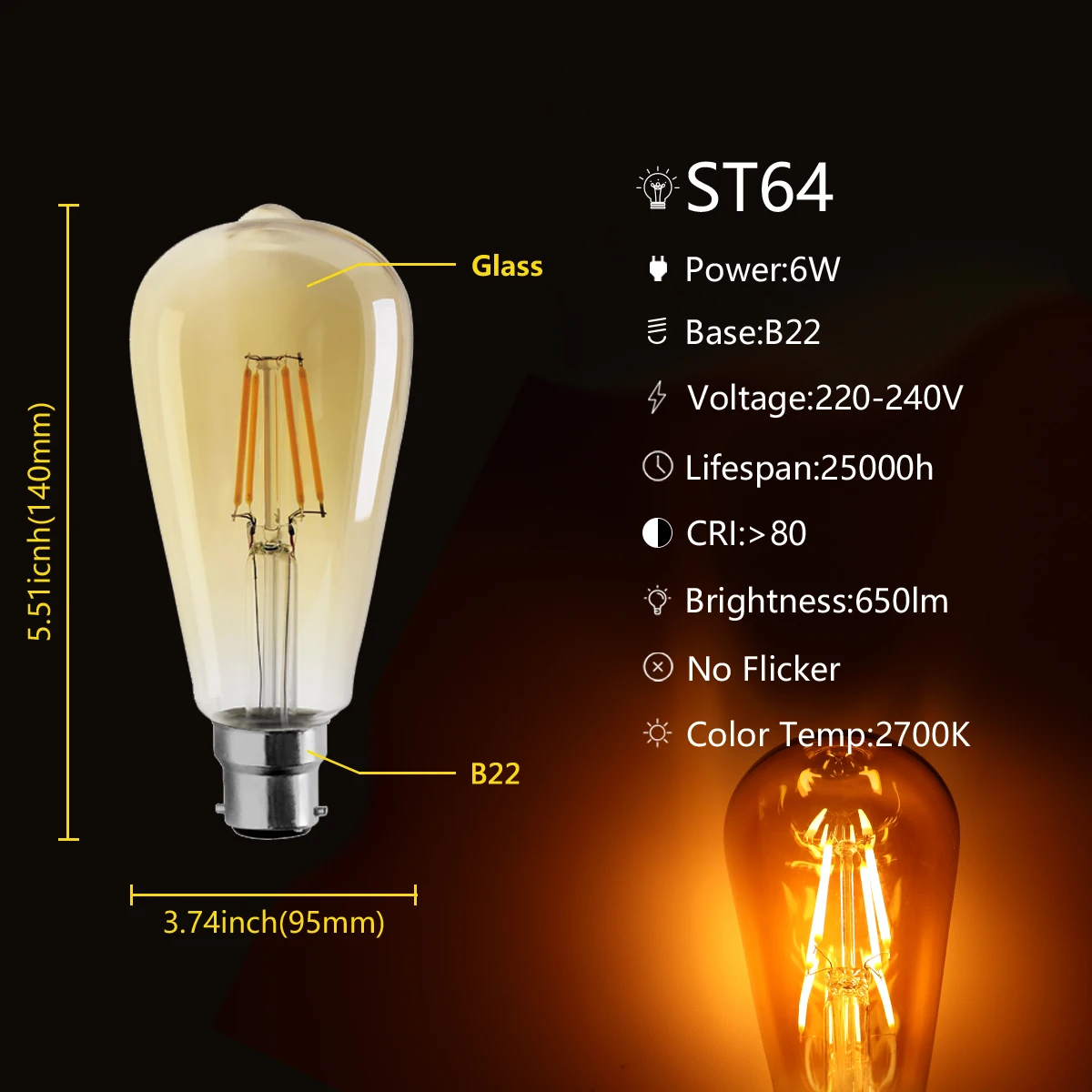 6 шт.лот St64 лампа накаливания 6 Вт B22 Ретро Эдисон 220-240 В винтажная стеклянная лампа 2700k