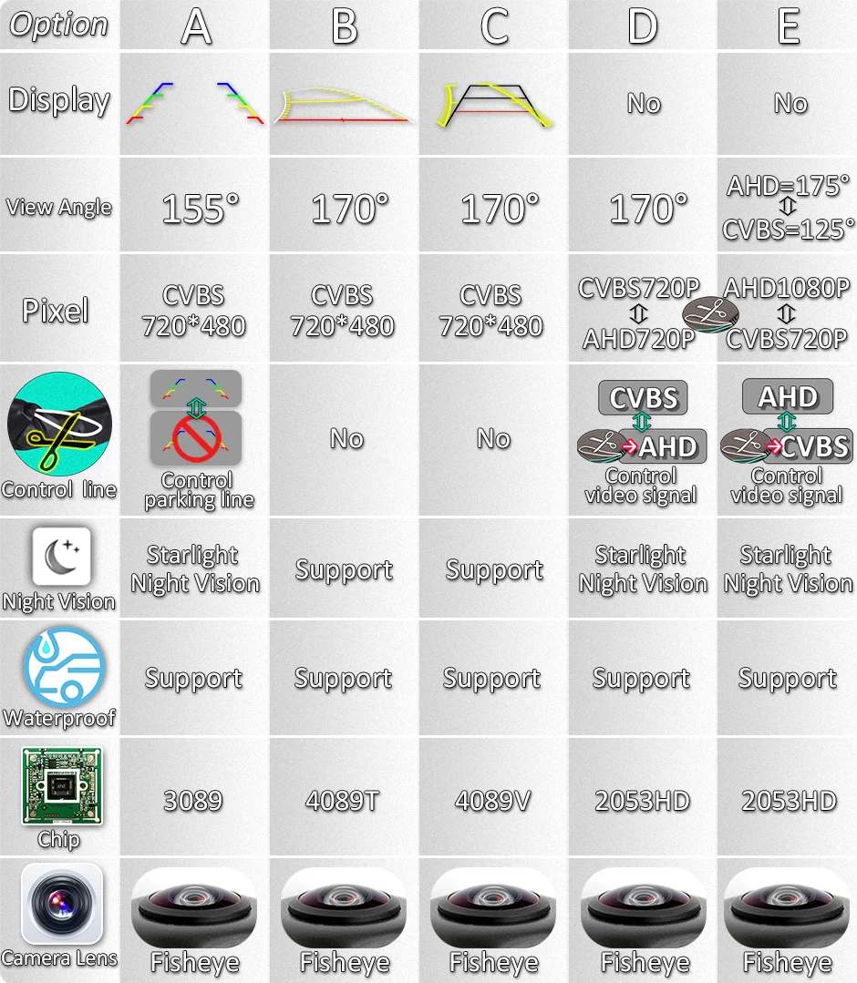 1. Камера AHD поддерживает только монитор AHD.2. Камера AHD1080P поддерживает только монитор AHD1080P.3. Опция A, B, D, E-камера подходит для: изделия общего назначения, непосредственно подключается к AV-кабелю.4. Опция C камера подходит для: OEM MIB радиоприемник (требуется ESP/ESC) необходимо подключить интерфейс MIB.