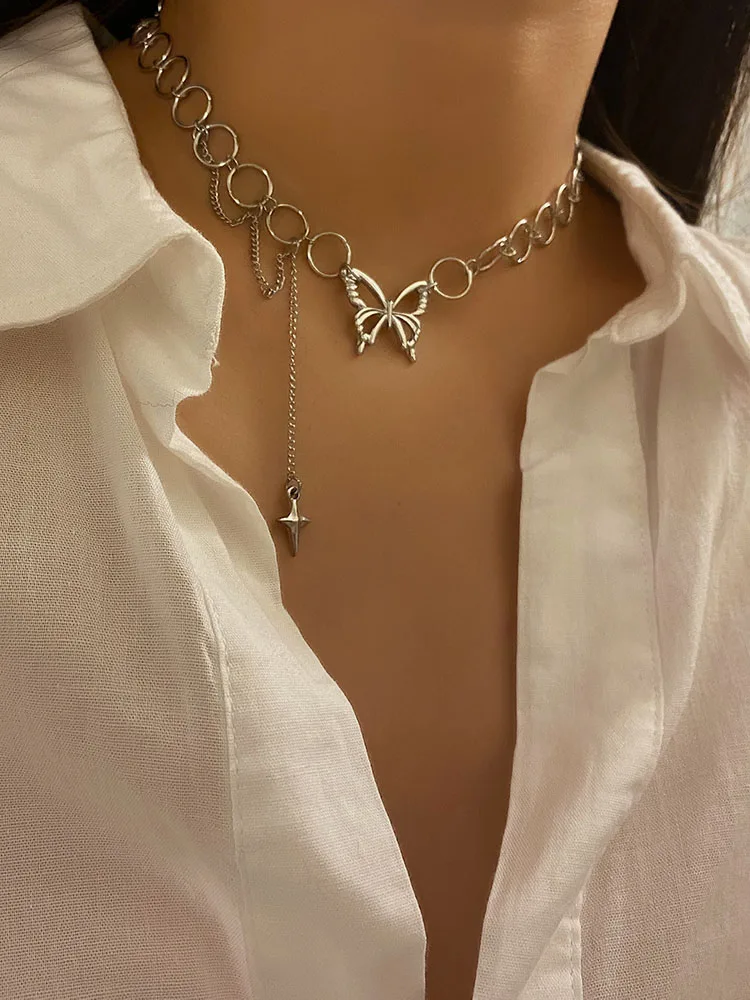 Блестящая бабочка подвеска колье светильник роскошных эстетические нишу многослойное украшение на шею с серебряным покрытием, ботинки для панков и готов, короткие ожерелья для женщин