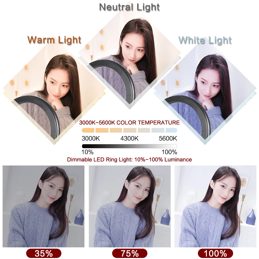 10 дюймов кольцевой светильник: с регулируемой яркостью и регулируется, вы можете отрегулировать светильник влияние от 10%-100%. Кольцевой светильник для селфи делает вас более привлекательным и очаровательным.