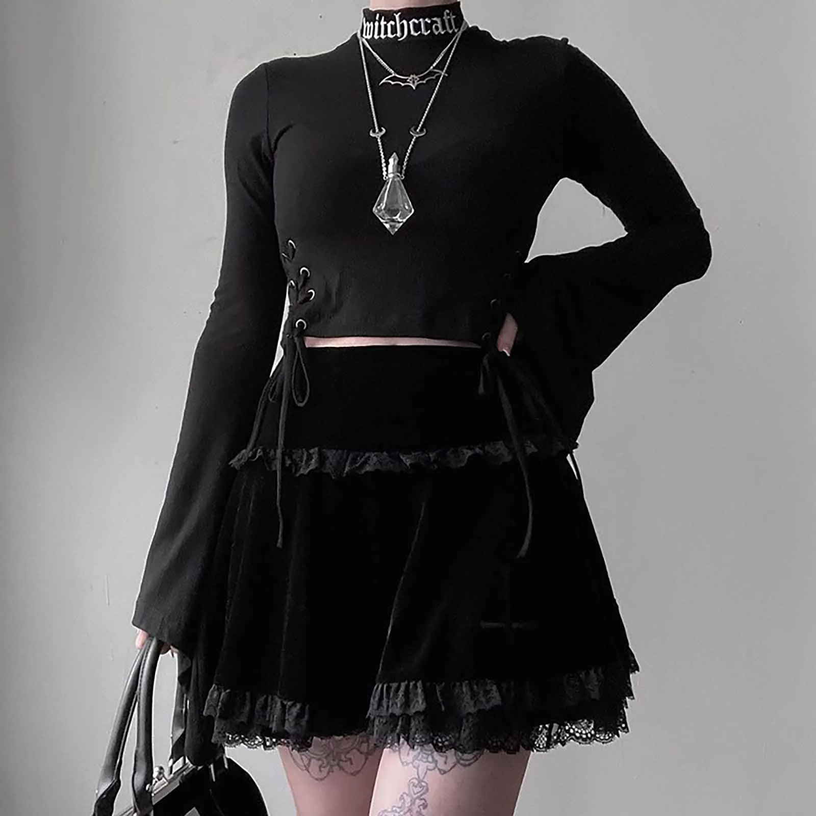 Черный Гот эстетическое плиссированные юбки женский с кружевной отделкой с низкой талией E мини-юбка для девушек в стиле панк темно Академии Y2K для танцев в уличном стиле