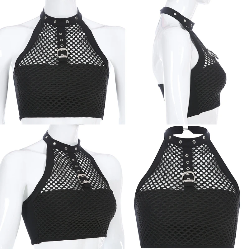 Женский короткий топ на бретельках для подростков и девочек, готический панк-топ с металлической пряжкой, сетчатый черный жилет, клубная одежда