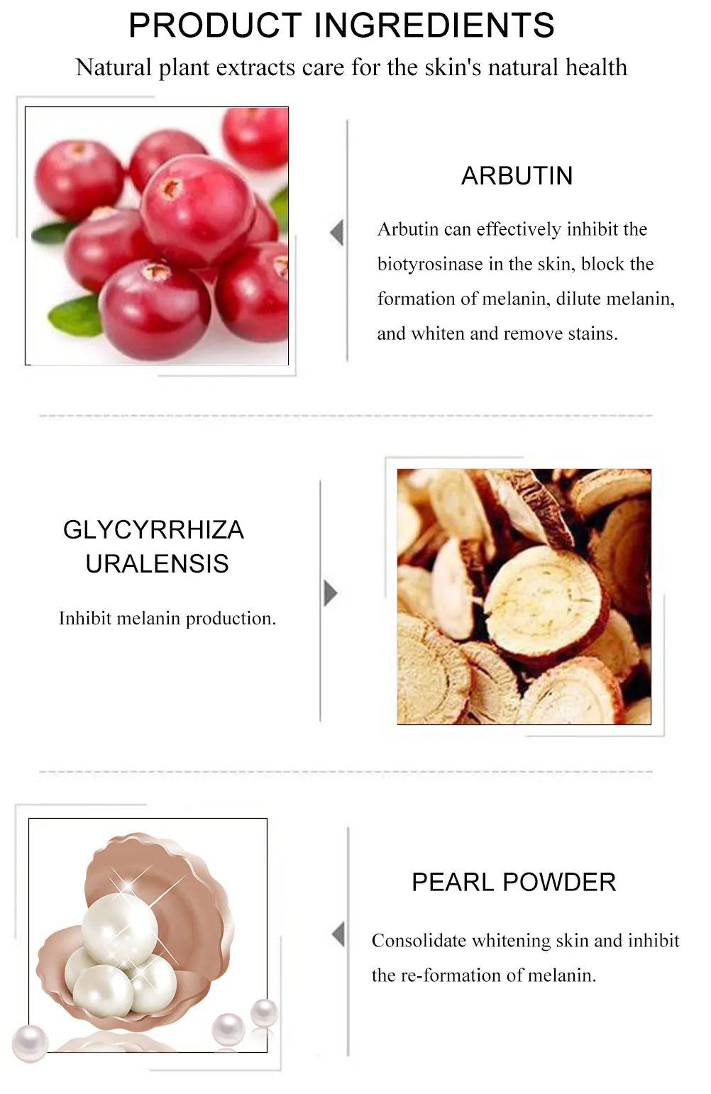 Натуральные растительные экстракты забота о естественном здоровье кожиАрбутинАрбутин может эффективно подавлять биотирозиназу в коже, блокировать образование меланина, разбавлять меланин, отбеливать и удалять пятна.Глициррхиза уралензИнгибирует производство меланина.Жемчужный порошокУкрепляет отбеливающую кожу и препятствует повторному образованию меланина.