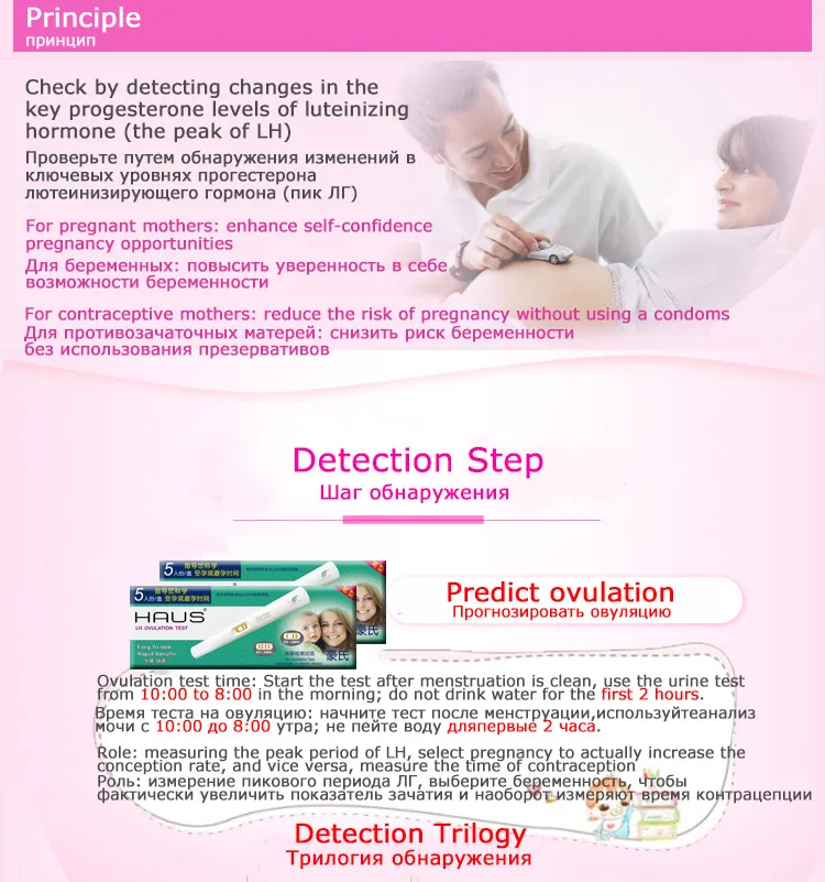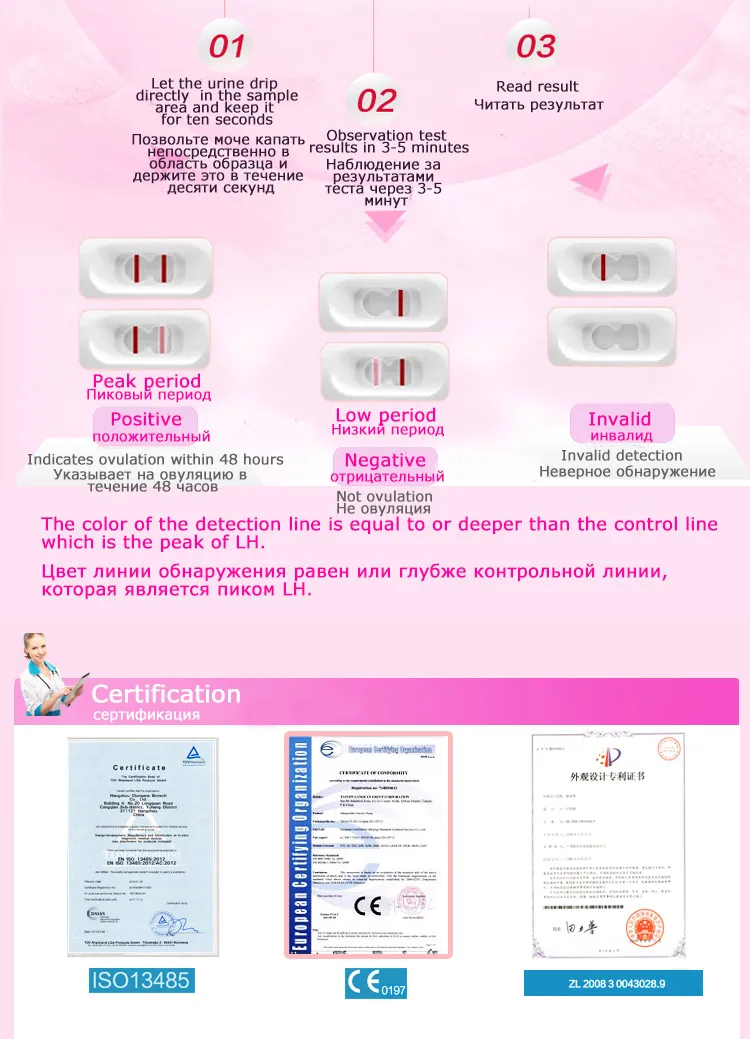 Использование: первый шаг-дать моче капать в области загрузки в течение 10 секунд. Второй шаг заключается в наблюдении за результатами испытаний в области тестирования в течение 3-5 минут. Третий шаг читает результатИнструкции: Не допускайте, чтобы уровень мочи превышал максимум (маркер линии), в противном случае тест может работать неправильно.Требуется полное время реакции 3 минуты, и ваш результат должен появиться в течение 3 минут. Не считывайте результаты через 5 минутКак читать результаты?Отрицательный: на области управления появляется только один цветной ремешок, или на тестовом ремешке появляется, но легче, чем на пульте управления. Это означает, что нет перенапряжения LH.Положительный: если видны две цветовые полосы, а тестовая полоса равна или темнее, чем контрольная полоса, вы, вероятно, овуляетесь в течение следующих 24-48 часов. Если вы хотите забеременеть, самое лучшее время для полового акта-это после 24 часов, но до 48 часов.Недопустимо: нет видимой ленты. Повторите с новым тестовым комплектом.Хранение и стабильность1. Храните от 39 до 86 °F (от 4 до 30 °C) в запечатанном мешке до истечения срока годности.2. Держите подальше от прямых солнечных лучей, влаги и тепла.3. Не замораживайте.