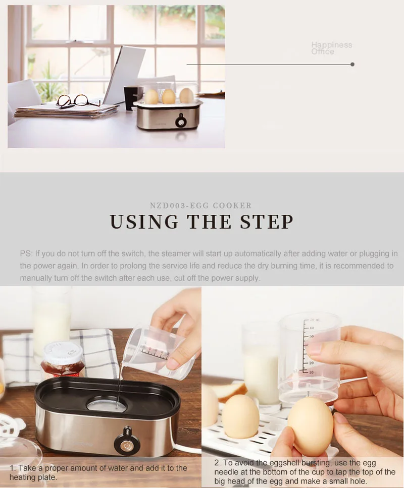Вареное яйцо: трехвареное, полувареное, семивареное, полностью вареное. 1. Приготовлено из трех точек: около 12 мл воды (слегка приготовленные яйца, яичный желток протекает); 2. Приготовленный из пяти точек: около 15 мл воды (мягкий яичный желток, густой яичный аромат); 3. Приготовленная семь точек: около 20 мл воды (свертывание белка, промежуточное замороженное яичный желток); 4. Полная готовка: около 30 мл воды (белок яичный желток полностью затвердевает) PS: если вы не выключите переключатель, отпариватель начнет автоматически после добавления воды или повторного подключения питания. Чтобы продлить срок службы и сократить время сухого горения, рекомендуется вручную выключать переключатель после каждого использования, отключать источник питания.