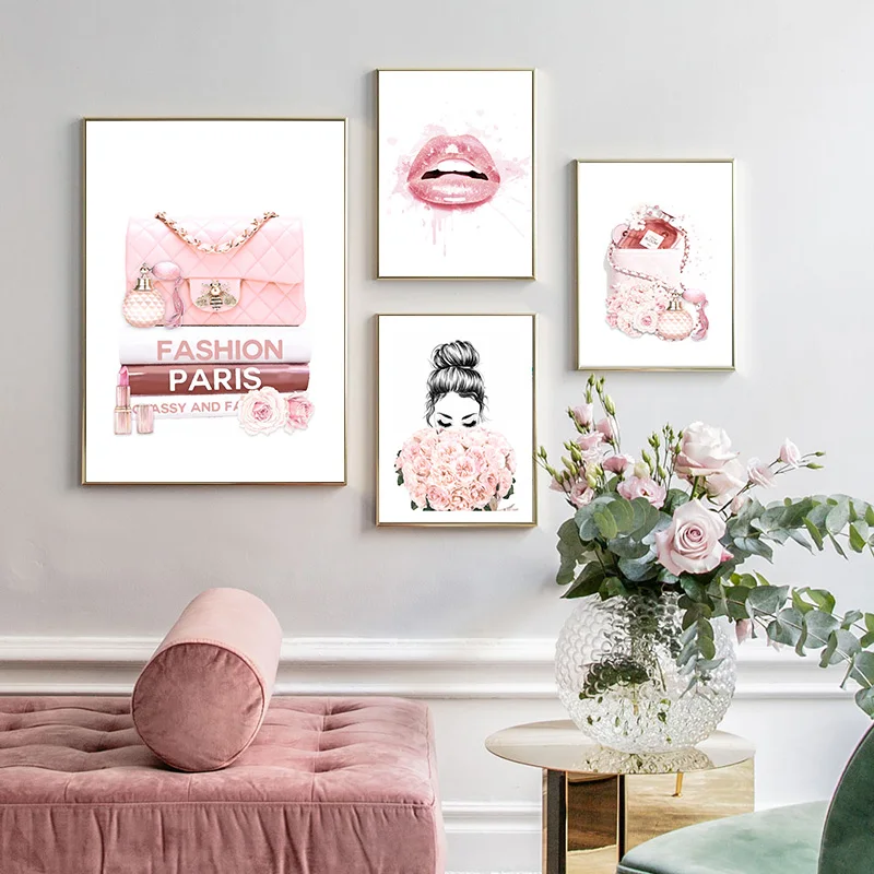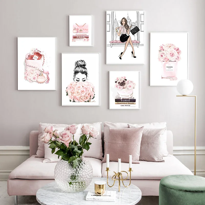 Модный постер розового цвета с цветочным принтом в виде духов, книг...