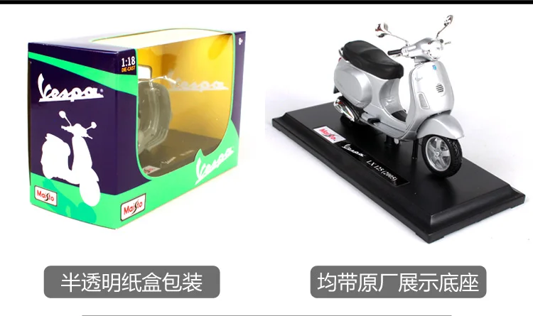 Примечание: только топливный бак изготовлен из металла, остальные изготовлены из пластика.Наименование: Мотоцикл VESPAБренд: MaistoРазмеры: около 12cmX4.5cmX6.5cmМасштаб: 1:18Материал: литой металл с пластиковыми деталямиУпаковка: Полноцветная оконная коробкаФункция:● Переднее колесо и руль могут качаться из стороны в сторону● Подвижная подставка● Пружинная задняя подвеска● Колеса свободной прокатки