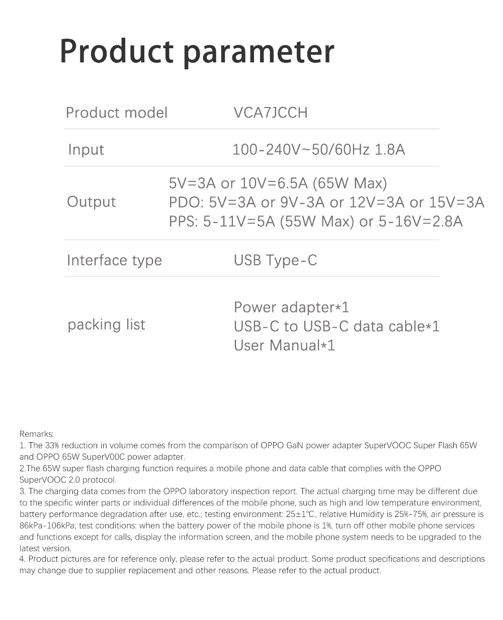 Параметры продукта Модель продукта: VCA7JCCH Вход: 100-240V ~ 50/60Hz 1.8A Выход: 5 В = 3 А или 10 В = 6,5a (65 Вт макс.) PDO: 5 В = 3 А или 9 В-3 А или 12 В = 3 А или 15 В = 3 А PPS: 5-11V = 5A (55W Max) или 5-16V = 2.8A Тип интерфейса: USB type-C Упаковочный лист: Адаптер питания * 1 USB-C для USB-C кабель для передачи данных * 1 Руководство пользователя * 1