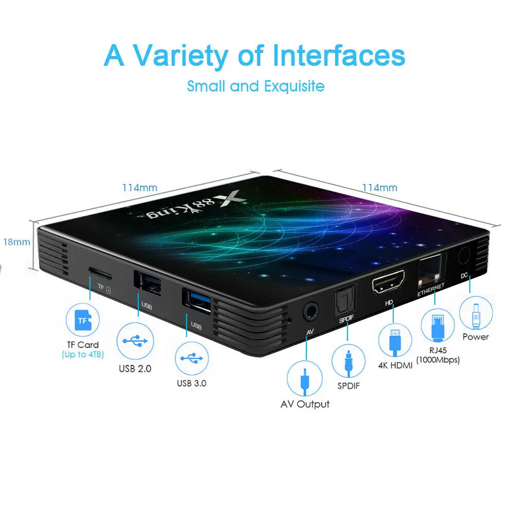Характеристика: -AmlogicS922XQuad-core Cortex-A73 ARM и Двухъядерный процессор ARM Cortex-A53 -Графический процессор: гекса-core ARM G52 MP6 Graphics -ОЗУ: DDR4 4 Гб -ROM:eMMC 128 ГБ -Android 9.0OS -Видеовыход UHD 4K и H.265 аппаратное декодирование -2,4G/5 ГГц двухдиапазонный WiFi,Bluetooth беспроводное соединение -1000 м LAN Ethernet RJ45