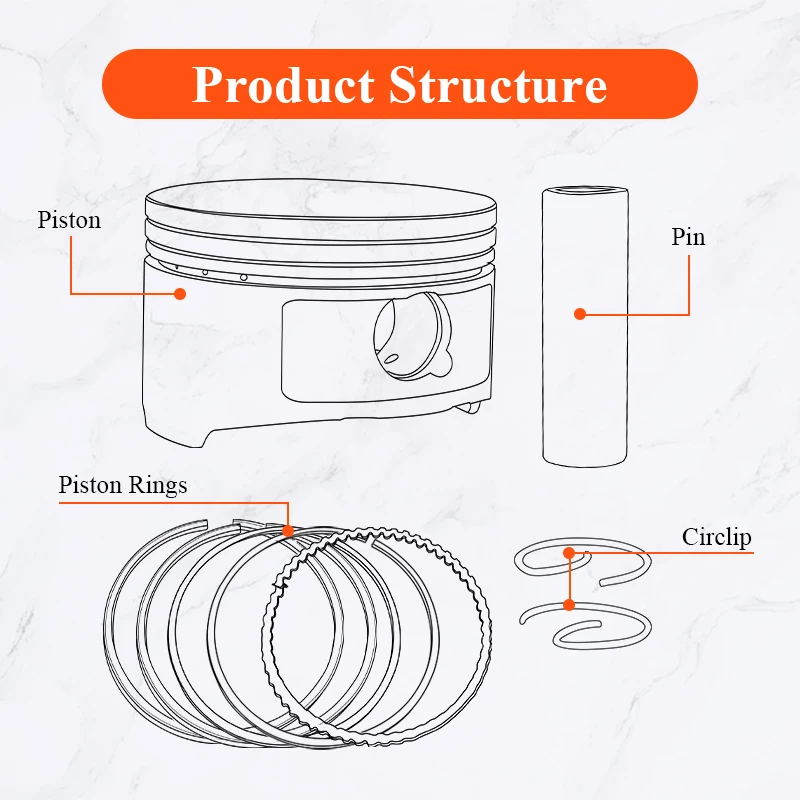 Особенность:Поддерживайте герметичность сжатого смешанного пара в цилиндреКонтролируйте моторное масло в картере, чтобы чрезмерно попасть в камеру сгоранияЭффективно передает тепло от верхней части поршня к радиатору блока цилиндровЭффективно предотвращает сильный контакт между поршнем и стенкой цилиндра