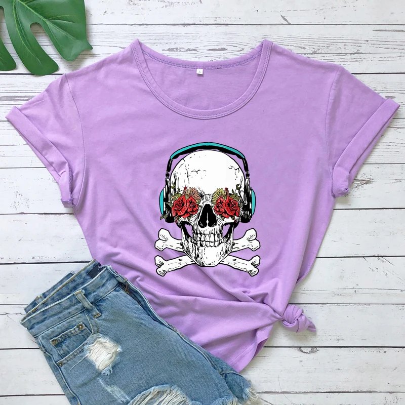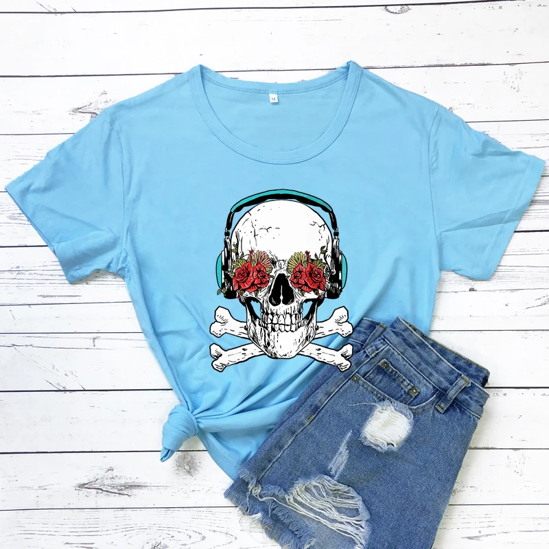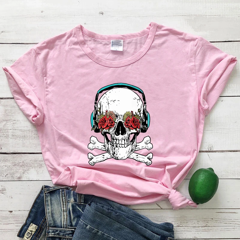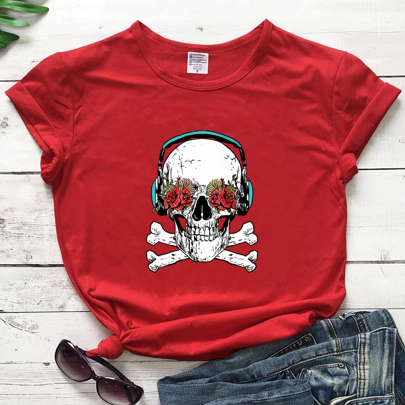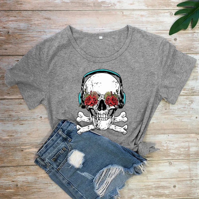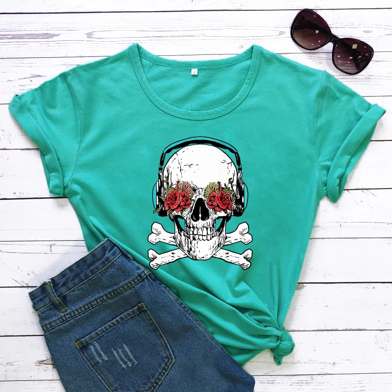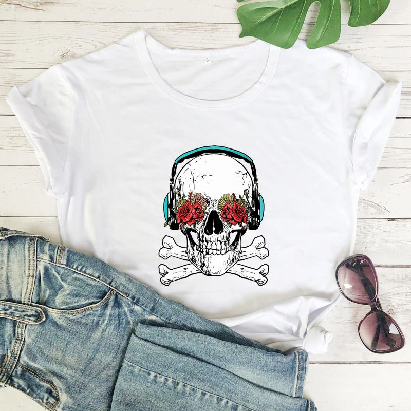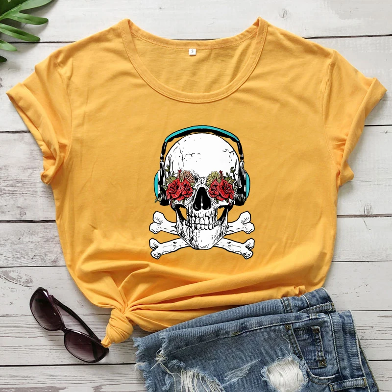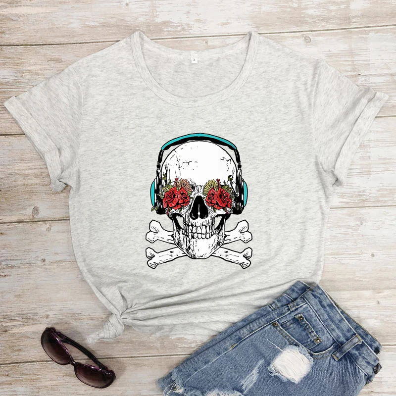 Футболка унисекс с изображением черепа в наушниках, цветная рубашка в стиле музыкального искусства, винтажный хипстерский Топ для женщин