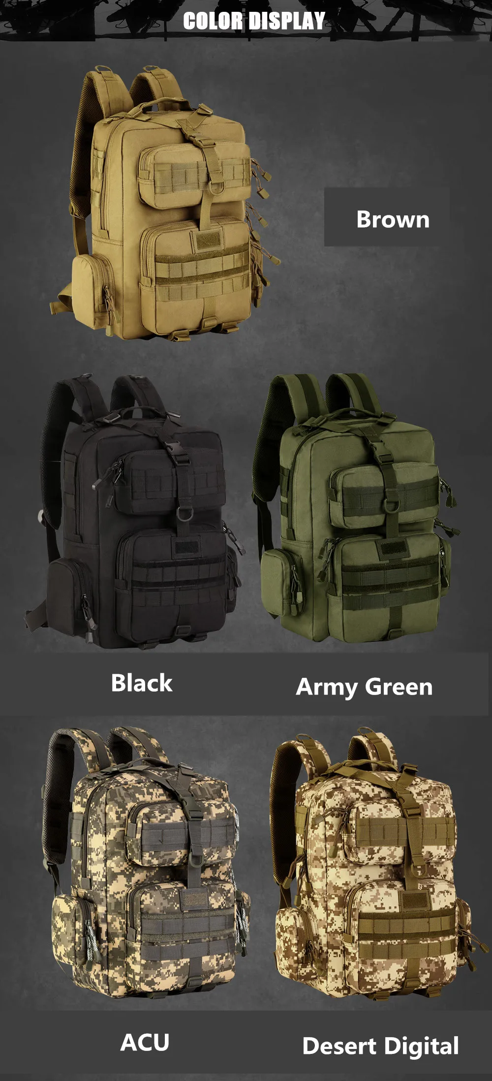 Colorblack,brown,army green,ACU digital,deset digital