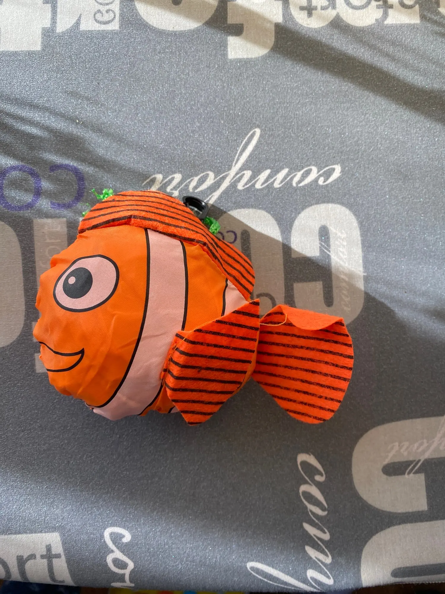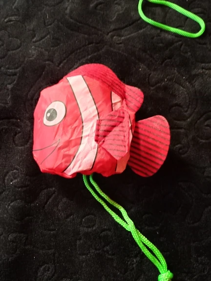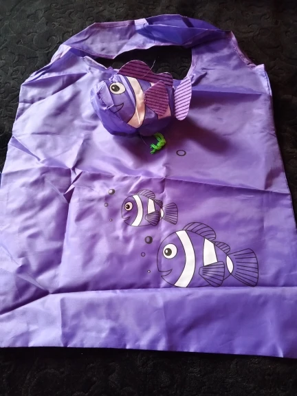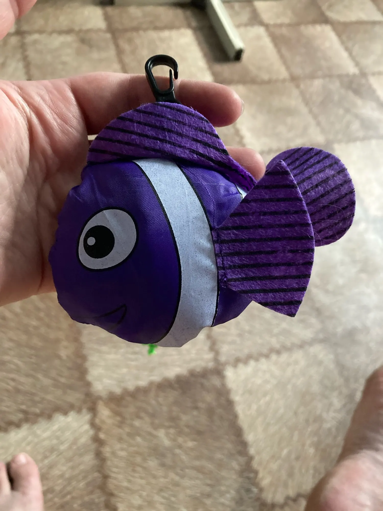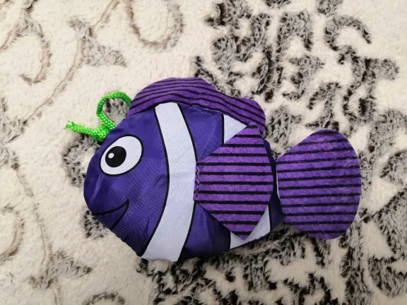 Пришла в разложенном виде, сложила в саму рыбку и мне расхотелось использовать вещь, как сумку, а задействовать её в виде брелока очень милая рыбка получается, полностью соответствует описанию, вместительная. Она в реальности выглядит даже привлекательнее, чем на странице товара.