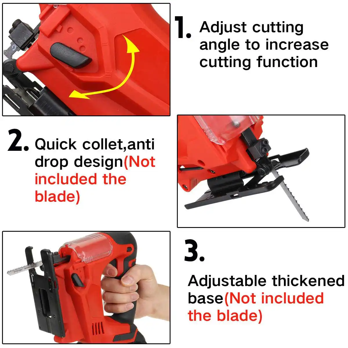 Особенности-4 регулируемых угла резки-Установка пильного полотна с защитой от падения, экономия времени и усилий-Нескользящая ручка: легко носить с собой-Самофиксирующийся в случае ошибки-Вентиляционное отверстие для охлаждения предотвращают выгорание двигателя.