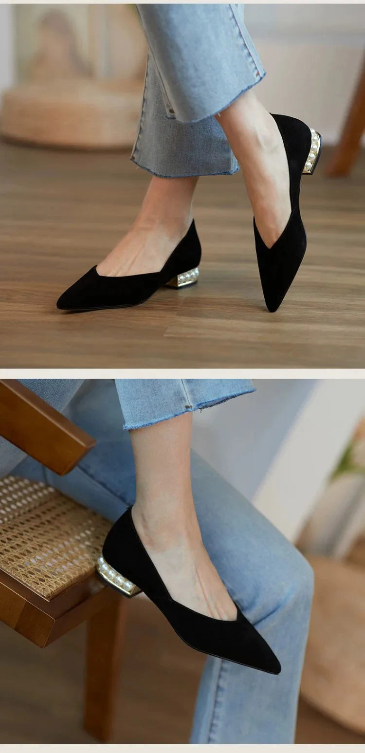Туфли-лодочки женские с жемчужинами, модная обувь на каблуке, замша...