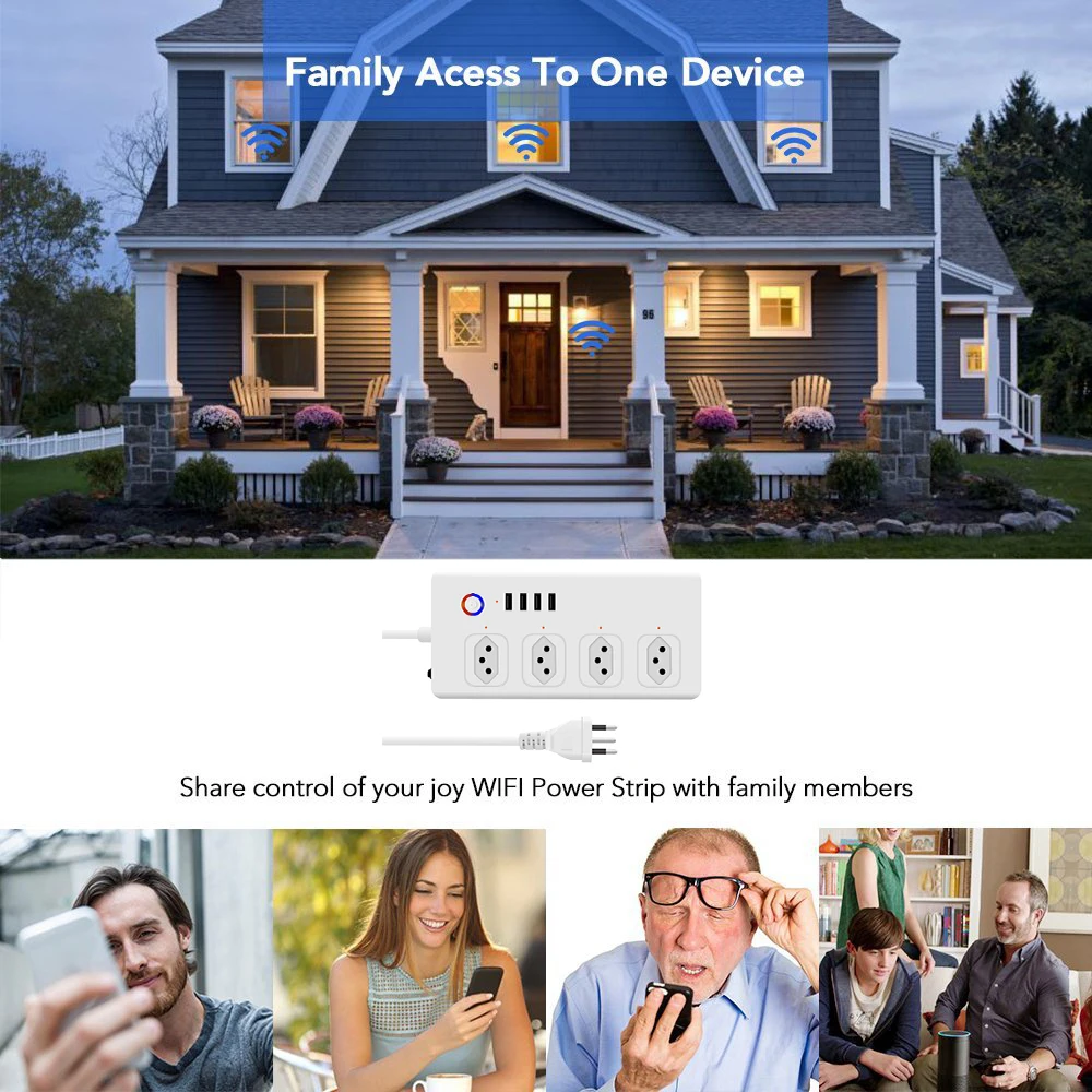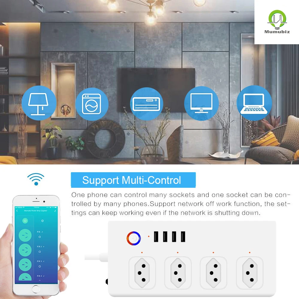 Дизайн независимо управляет 4 интеллектуальными розетками и заряжает 4 устройства со встроенными USB-портами, идеально подходит для управления электроникой в домашнем офисе или малом бизнесе.