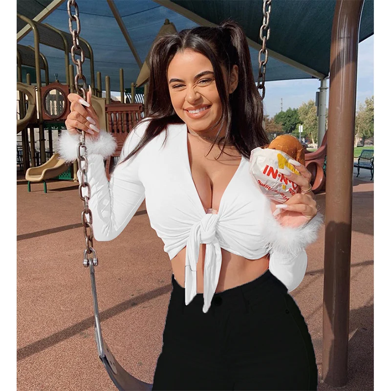 2021 Длинные рукава мех v-образный вырез завернутый бандаж сексуальные топы на осень-зиму женская уличная костюмы для вечеринок детские футболки