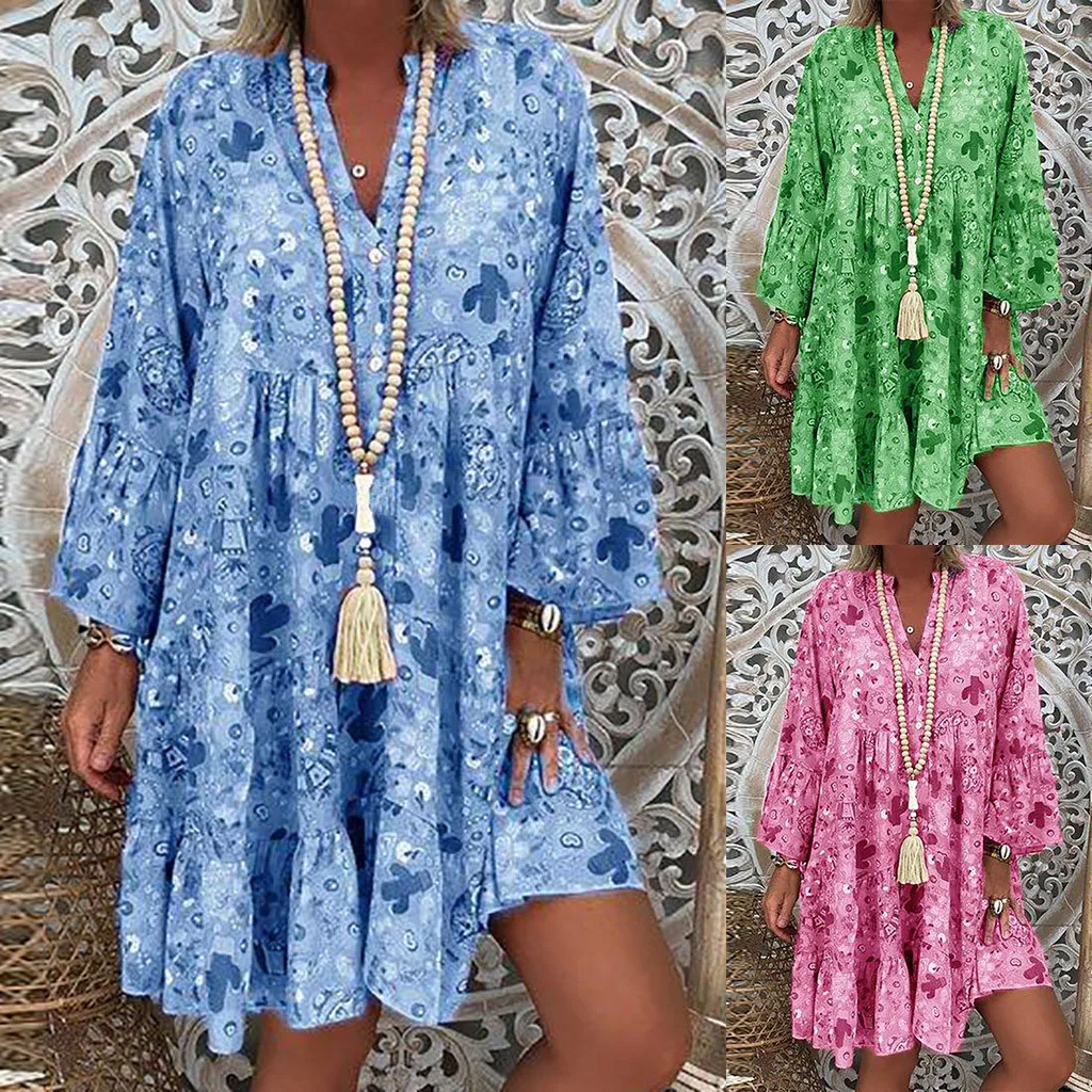 Женское свободное мини-платье с принтом и рукавом три четверти, летнее платье
