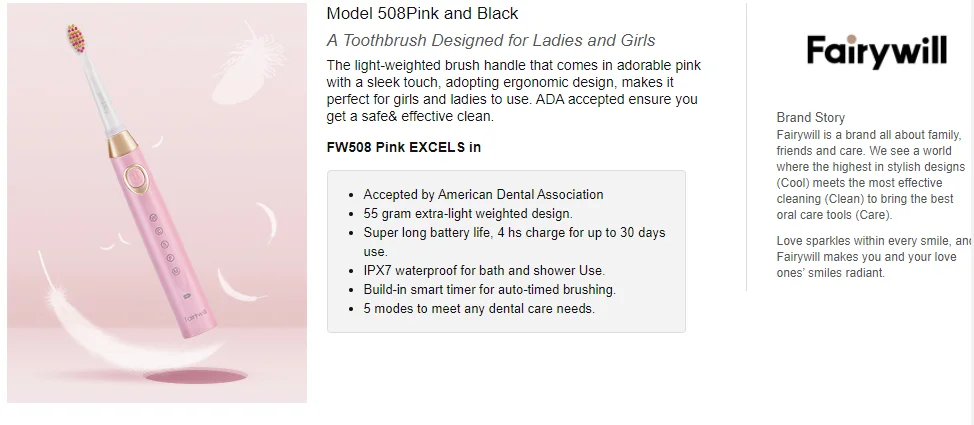 Совет ADA по приему Scientific Affairs звуковой электрической зубной щетки Fairywill 508 основан на его выводе о том, что продукт безопасен и демонстрирует эффективность в удалении зубного налета и помогает предотвратить и уменьшить гингивит, при использовании в соответствии с направлениями.