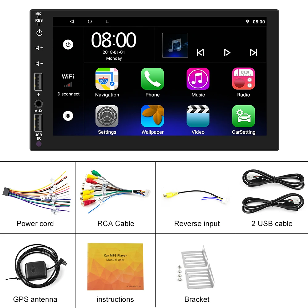 1,7 дюймов HD Автомобильный Радио MP5 плеер с цифровой сенсорный экран. 2.Android смартфоны для зеркальной связи через Wifi и USB, Подключение Iphone к зеркалу через wifi 3. Поддержка Bluetooth громкой связи, Bluetooth музыкальный плеер. 4. Интернет-развлечения, встроенный модуль Wi-Fi, поддерживает подключение Wi-Fi горячих точек к серфингу в Интернете. 5. Встроенный модуль GPS, поддерживает как онлайн, так и автономное навигационное приложение в форме Google Play app market. С подключением Wi-Fi, Google Maps можно использовать идеально, вы можете пойти куда угодно и никогда не потеряться снова. 6. Этот вход Автоматически Заряжает заднюю камеру, когда транспортное средство переключается в обратную сторону и отображает изображение на экране устройства. Задняя камера продается отдельно. 7. Поддержка оригинальной кнопки рулевого колеса автомобиля, функция обучения, через нее вы можете управлять функциями, которые вам нужны, с помощью рулевого колеса, более удобно. 8. Поддерживает sd-карты памяти до 32 Гб для воспроизведения музыки на устройствах без мониторов и музыки, воспроизведения фотографий и видео на устройствах с мониторами. 9. Функция FM AM RDS: fm-радио с высококачественной стереосистемой, которая может осуществлять поиск каналов полностью автоматическим способом, полуавтоматическим способом и регулируемым способом. 10. Функция эквалайзера и выход сабвуфера. 11. Поддерживает семь цветов подсветки, вы можете выбрать семь цветов в качестве подсветки. 12. Поддержка 4 usb-порта, два usb-порта на передней части машины и два usb-порта на задней части машины.