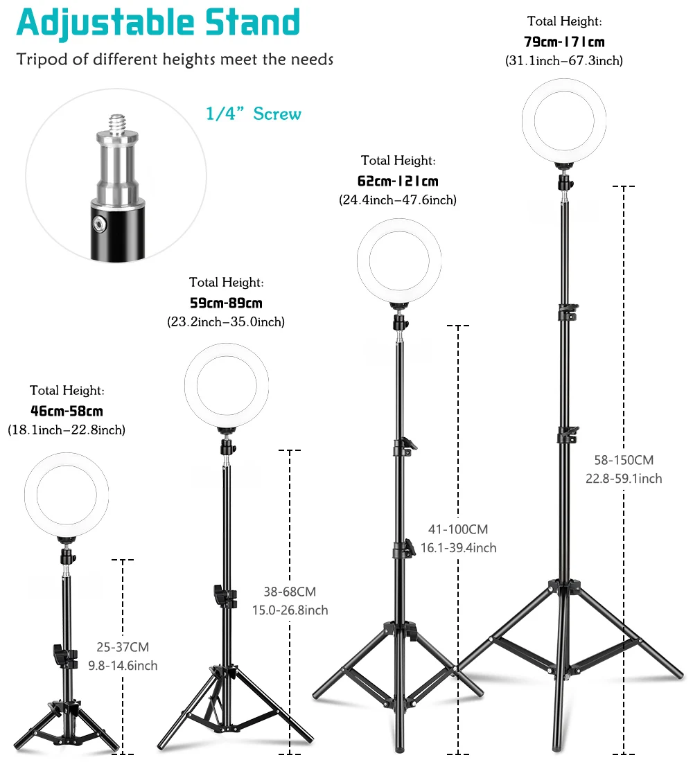 9 дюймов кольцевой светильник: с регулируемой яркостью и регулируется, вы можете отрегулировать светильник влияние от 1%-100%. Кольцевой светильник для селфи делает вас более привлекательным и очаровательным.