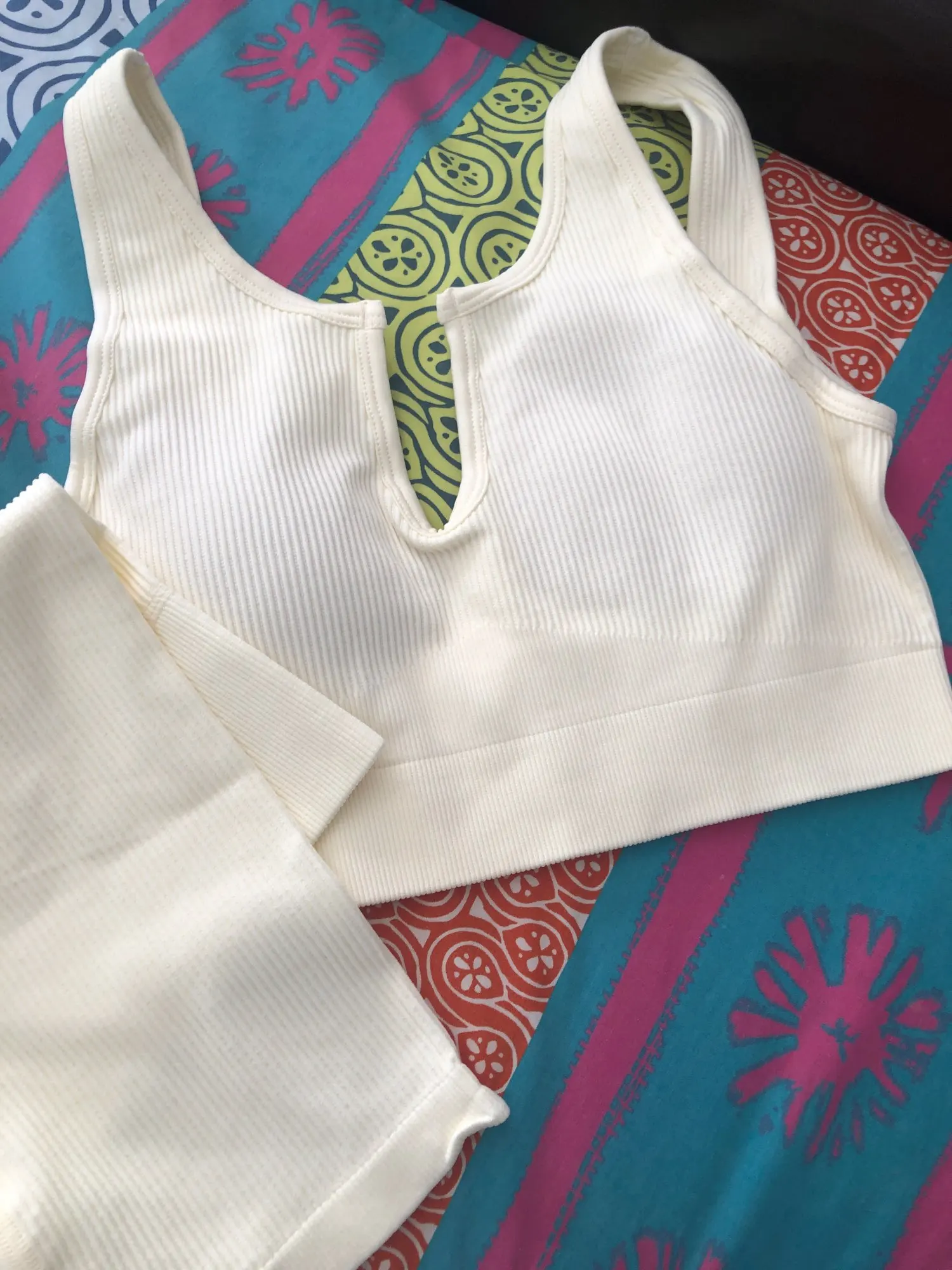 Цвет на самом деле, не Белый и не молочный. А светло-желтый. Я разочарована. На фото, шорты короткие, по факту, почти до колена, хотя мой рост 173 см. Лосины просвечиваются полностью, очень трудно подобрать нижнее белье, даже бесшовные бикини видно((((. Топ хороший, только его и придётся носить.