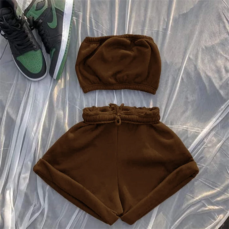 Однотонный женский летний спортивный костюм Adogirl, эластичный укороченный Топ без бретелек, модные повседневные шорты на шнуровке с высокой талией, комплект из двух предметов, домашний костюм