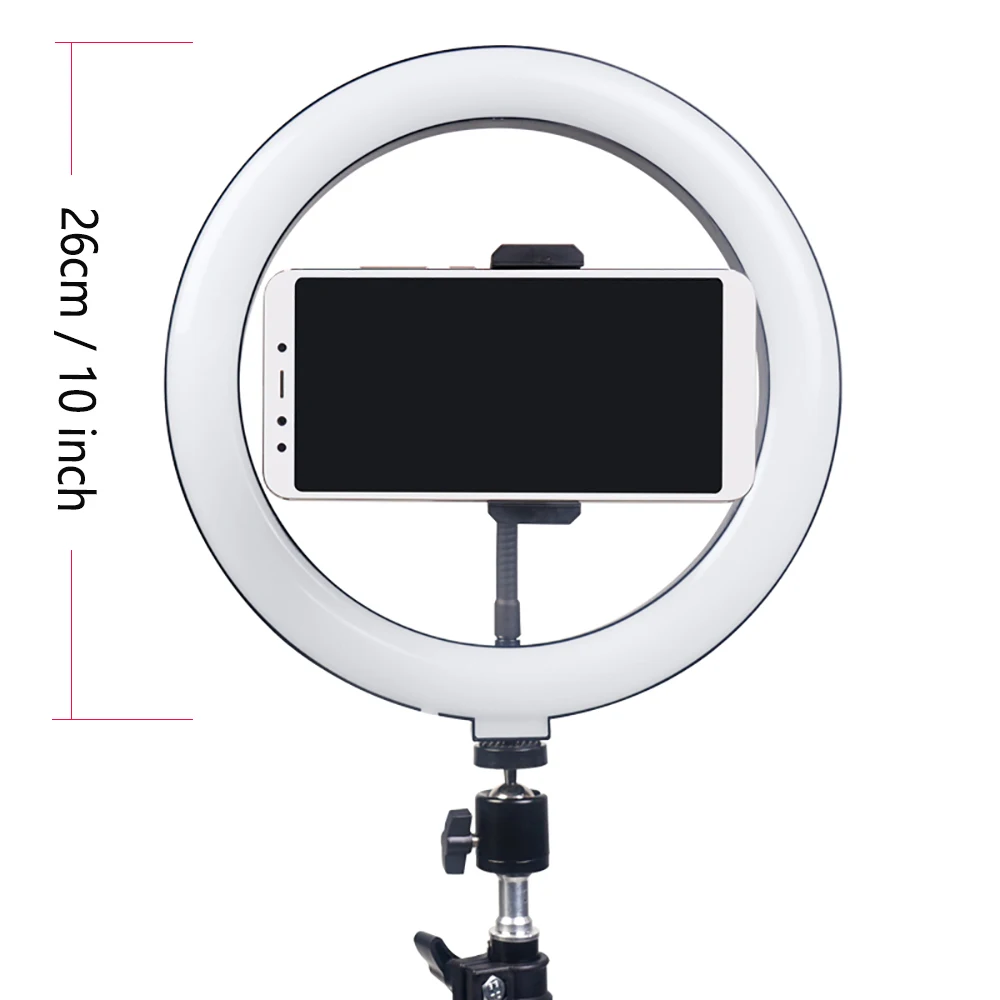 Кольцевой светильник для селфи, LED лампа с регулируемой яркостью, 10 дюймов, для Youtube, макияжа, прямых трансляций видео