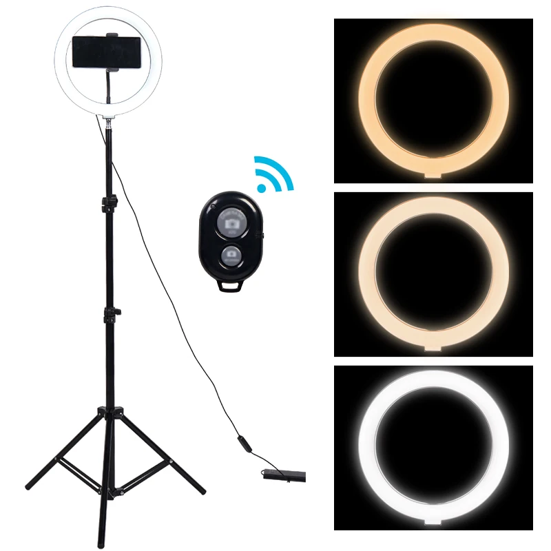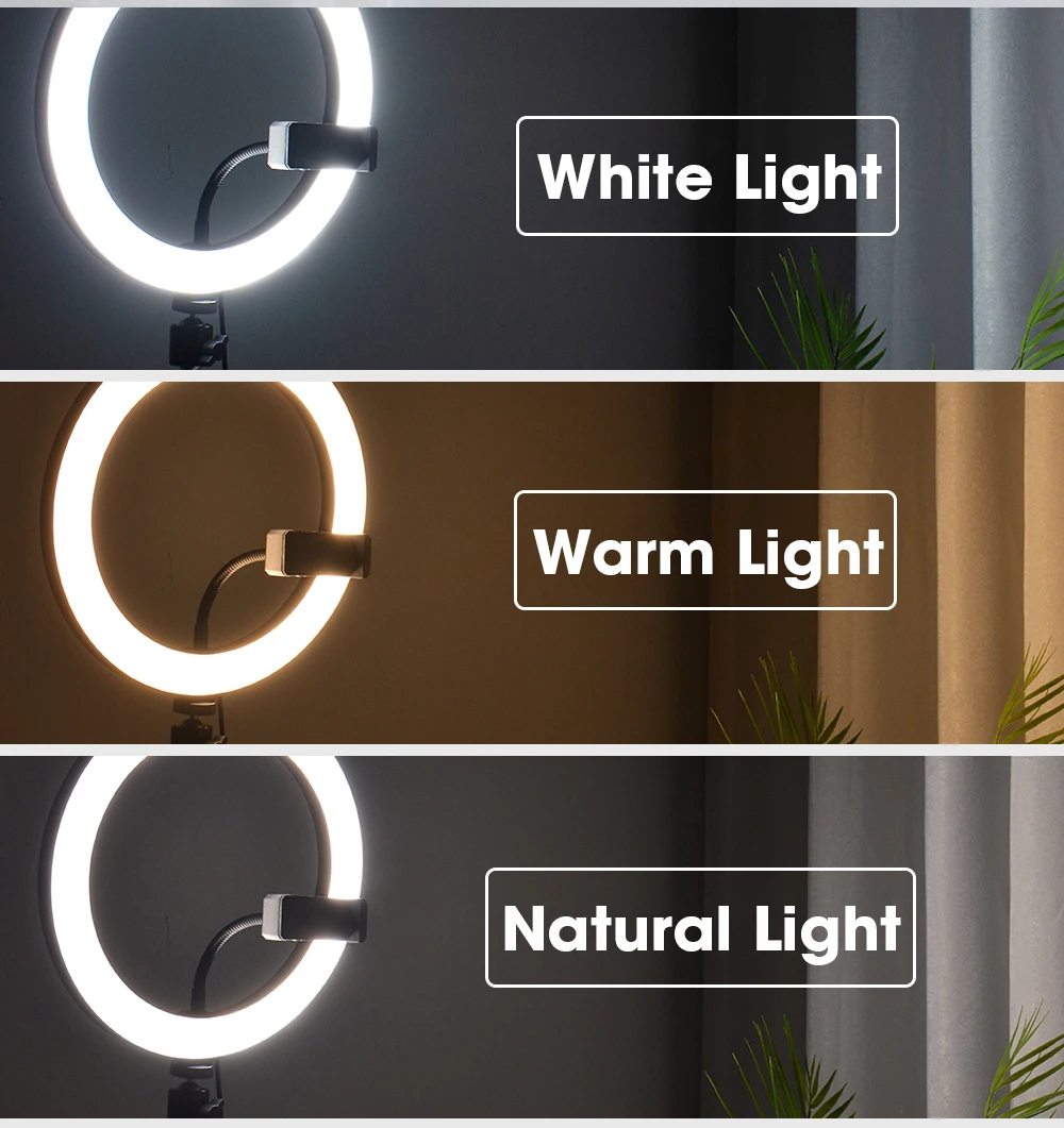 -Кольцевой светильник для селфи поставляется с подставкой для штатива и держателем для сотового телефона, 3 цвета светильник режим ing: белый, теплый желтый и теплый белый. Каждый режим освещения имеет 10 регулируемых яркости.