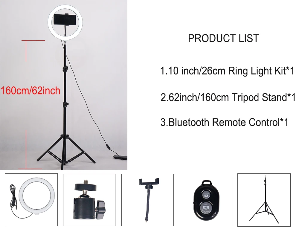 Список продуктов: 10 дюймов кольцевой светильник, bluetooth дистанционный пульт, подставка, универсальный шарнир, сотовом телефоне держатель