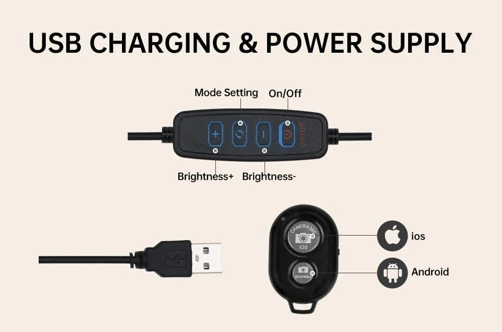 Питание от USB и беспроводное управление: светодиодный кольцевой светильник может питаться от любого источника питания USB, такого как настенные зарядные устройства, банки питания, ноутбуки и т. д. Пульт дистанционного управления Bluetooth работает с камерой телефона для активации затвора. Совместимость с Android и iOS.