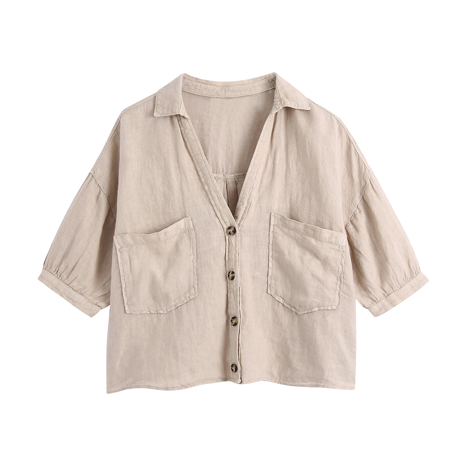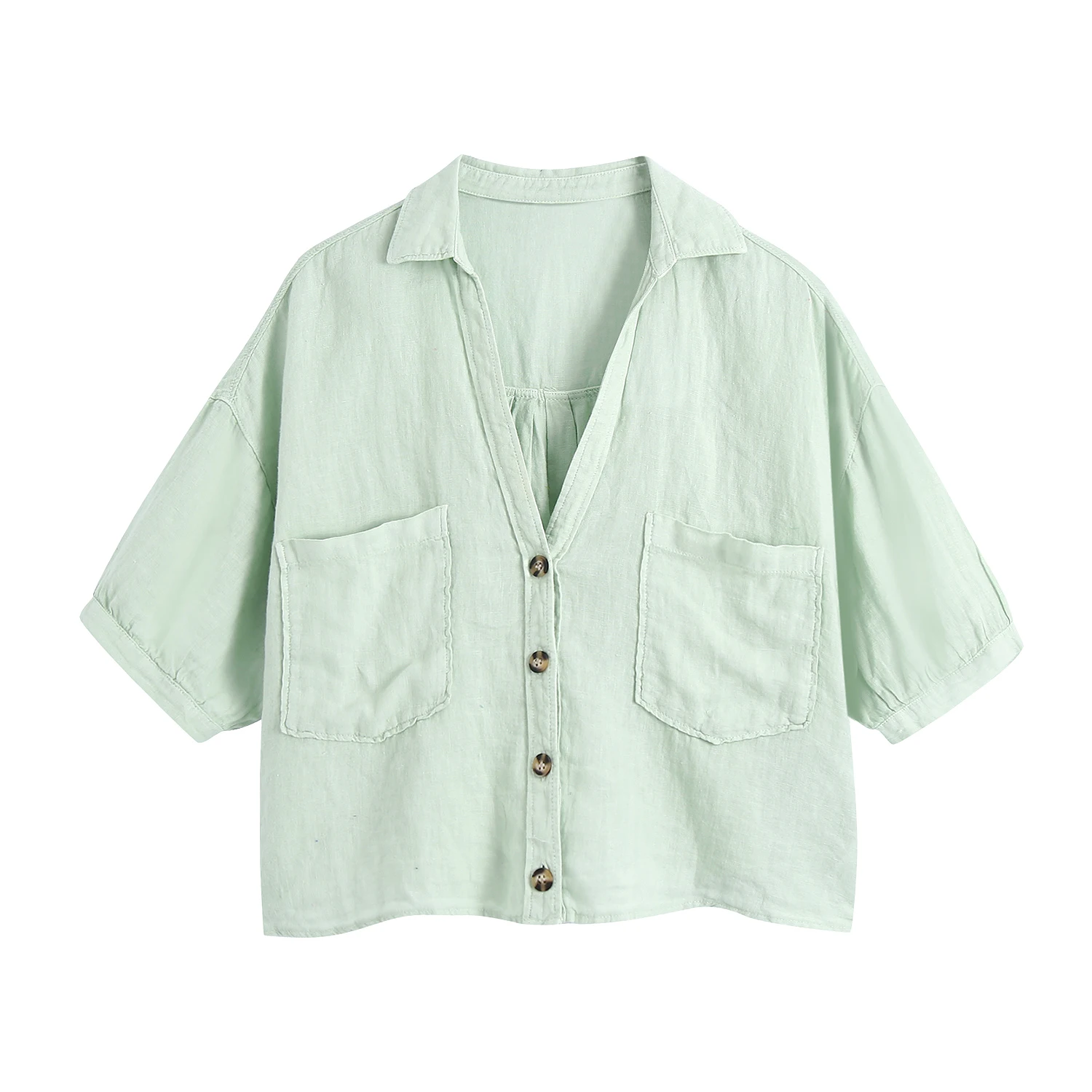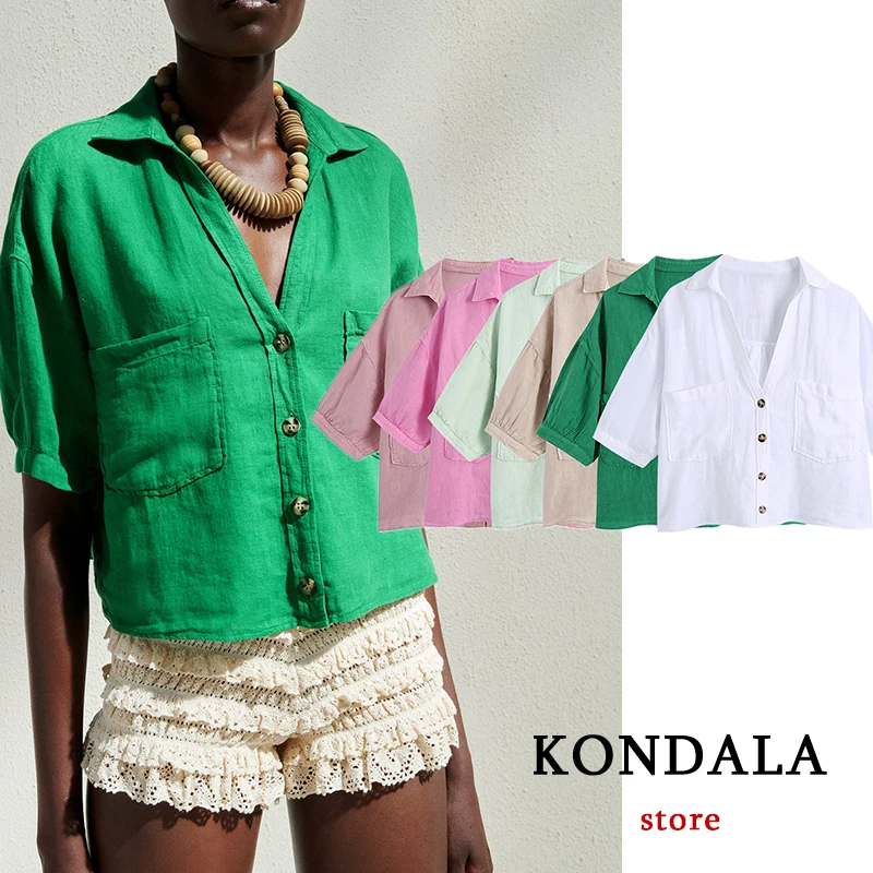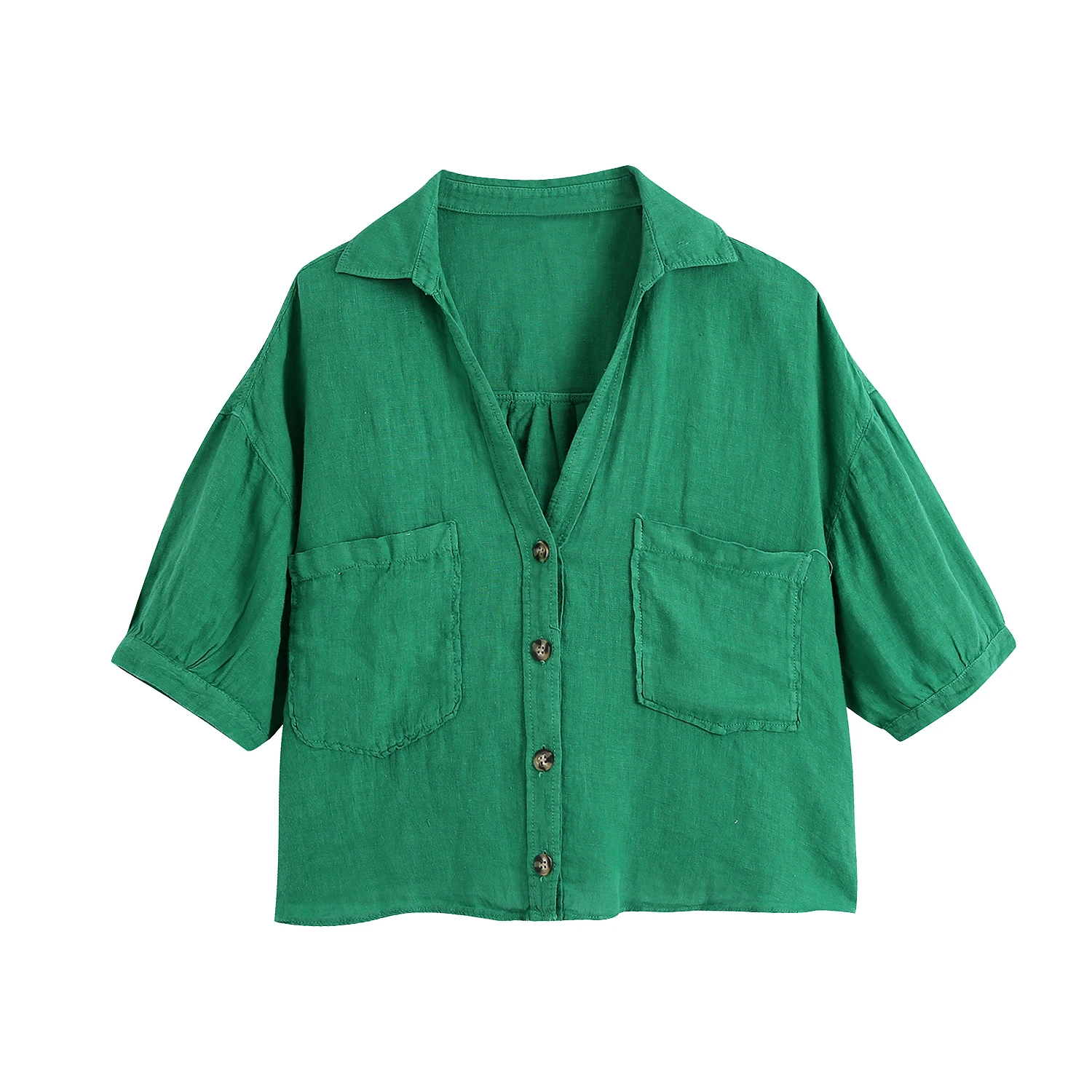 Женская рубашка с коротким рукавом KONDALA Za, однотонная зеленая Повседневная Блузка с V-образным вырезом и карманами, лето 2021