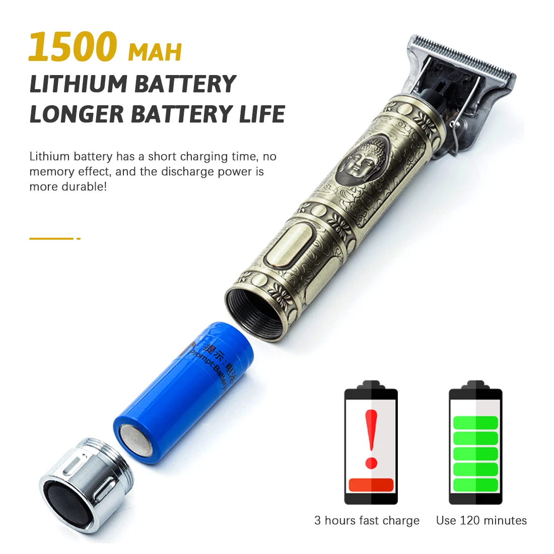 2. Зарядка через USB: Встроенный аккумулятор емкостью 1500 мАч используется для длительного использования. Машинка для стрижки волос используется для 120 минут после зарядки в течение 3 часов.